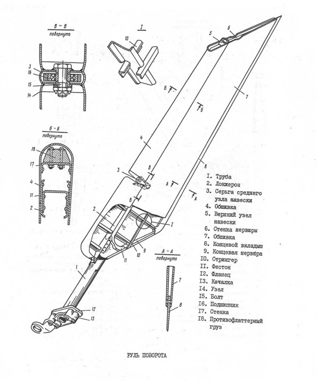 Руль поворота клепаной конструкции состоит из лонжеронов, стрингеров, набора нервюр, обшивки и трех узлов навески. По задней кромке руля поворота установлен концевой вкладыш для регулировки путевой устойчивости самолета.