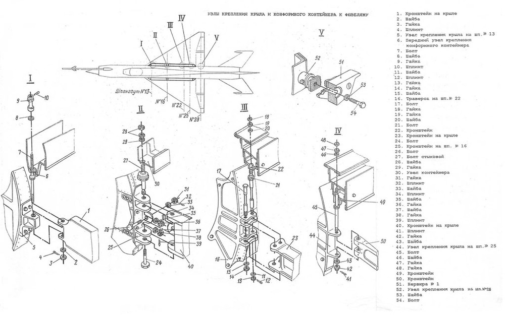 Крепление консоли к фюзеляжу осуществляется по стыковочным узлам на шпангоутах № 13, 16, 22, 25 и 28. Кроме того, в каждой консоли имеются два герметичных топливных отсека, образованных элементами конструкции крыла. По размаху закрылков в крыле установлен газовый канал системы сдува пограничного слоя с закрылков. В стыковочных узлах крепления консолей крыла с фюзеляжем сверху, на шпангоутах № 13, 16, 22, и 25 крепятся конформные контейнеры.