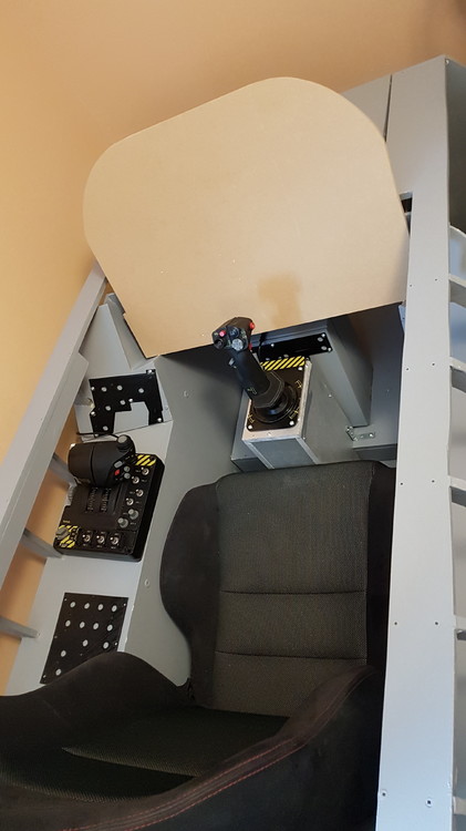 Exciting week...I got the pit up into the "office" area and have started working on it a little more. I modified the X-55 stick to be smaller to fit between my legs but the 3D printed base broke when connecting it to the wood base. So I cut a whole in the base and attached the stick to that. Seems to work...haven't tested in sim yet to ensure I didn't break anything during the hacking process. The throttle is a little big so I may us one of the Saitek throttle quads I have seeing I do want to use the pit for WW-1 and WW-2 birds as well. Next will be cutting a hole in the front panel to stick one of my 24" monitors behind it. I know it isn't going to be exactly like a Hornet, but it should do with what I have on hand. I hope you guys like it.