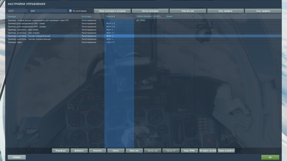 @Bazztardправый контрл + ентер нажми, вылезет окно с индикацией органов управления, на нём будет видно процесс триммирования. Открываешь настройки управления, вводишь в поиск "трим" и видишь все нужные комбинации. Если самолёт тянет вверх, тебе нужен отрицательный тангаж, значит зажимаешь правый кнтрл + ; (или правый кнтрл + ж на если на русской раскладке) и смотришь по индикатору отклонение органов и по поведению самолёта, если перестарался и самолёт начало тянуть вниз, жми положительный тангаж, т.е команда RCtrl + . Если самолёт не сильно задирает, то лучше не зажимать, а короткими нажатиями подстраивать. Там всё элементарно. Если у тебя кренит самолёт вправо или влево, после схода ракет например, то тебе нужно по крену триммировать в противоположную сторону. На некоторых модулях могут отличаться настройки, поэтому ищешь через поиск по ключевым словам "трим" или "trim" (если настройки не переведены) и смотришь нужные команды. В видео я управлял самолётом исключительно триммером. Показал триммирование до форсажа и после, всё легко и просто.