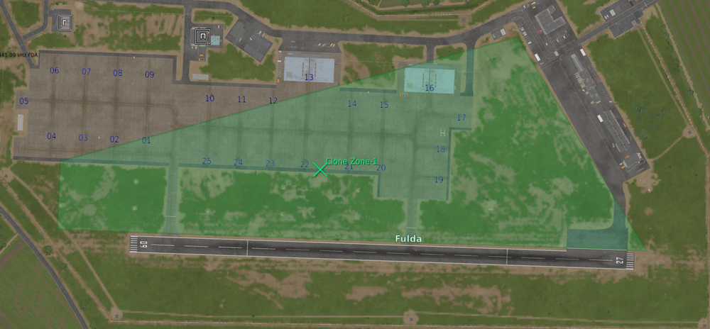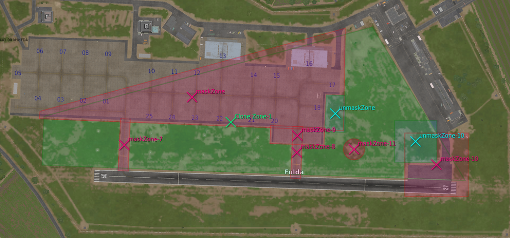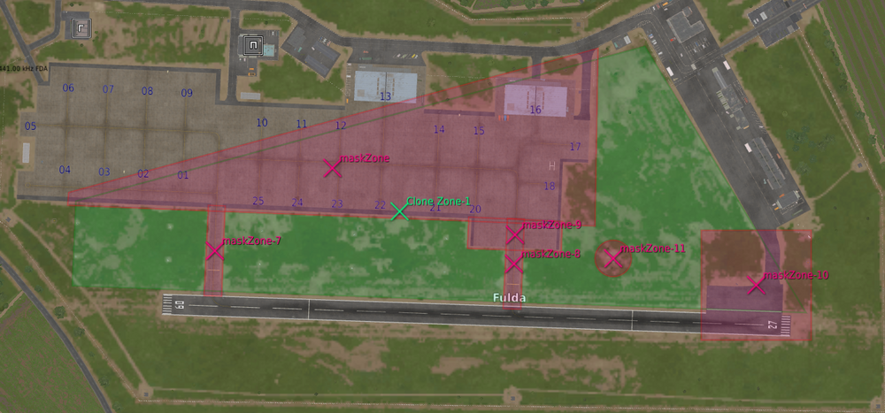 Hey cfrag I had an idea for an enhancement to good old clone zones I wanted to run by you. With the newer maps having so much detail what we really be awesome is the ability to create super detailed multipoint zones we can use to define clone/spawn areas, but ED hasn't given us that feature yet. So how about something else that still fits within the DML-style of things and accomplishes almost the same thing. Enter: mask zones and unmask zones. The basic idea is create a clone zone, then create zones within the clone zone that define where units shouldn't spawn. In a sense this would function a lot like the inBuiltup option for rndLoc, except instead of looking for map objects to determine where not to spawn, DML looks for user defined mask zones to determine where not to spawn. Example! Basic quad-point clone zone, we want to clone a multi-unit SAM site from a source template (not illustrated) to a random point into this zone. So we set up a clone zone with rndLoc set to true, link it to a source zone, assume we are using the wholeGroups option. null But we don't want that SAM site to spawn in the wooded areas within our clone zone, so here's where we add the new feature mask zones! These magical quad-point zones tagged with the mask zone attribute define where we don't want the units to spawn. Now in DML terms (and with a lot of cfrag wizardry) we have a clone zone that effectively looks like this! DML picks a random spot within our clone zone, and if that spot happens to fall within one of our mask zones, try again. And here it is again with all the quad-point zones hidden for illustrative purposes. That's one fancy looking clone zone! But wait a sec what was that about unmask zones? These would give us an extra little trick up our sleeves to make some really detailed stuff. Another Example!! Basic quad-point clone zone at Fulda. We want to spawn an air defense unit at a randomly selected point in this zone. But we don't want it to spawn in the parking area, on taxiways, or in the little patch of trees so we add mask zones to define those areas. But wait a sec those mask zones block off a little too much spawn area so we add unmask zones to define areas within the mask zones we added earlier that we will still allow units to spawn! And once again in DML-terms (and a bunch more of cfrag's wizardry) we have a clone zone that looks like this! DML picks a random spot within our original clone zone, and if that spot falls within one of our mask zones, try again, unless that spot also falls within one of our unmask zones. And here it is once again with the all the zones hidden for illustrative purposes. That's ONE fancy looking clone zone! Just some ideas. Love everything you do and thank you for DML! -