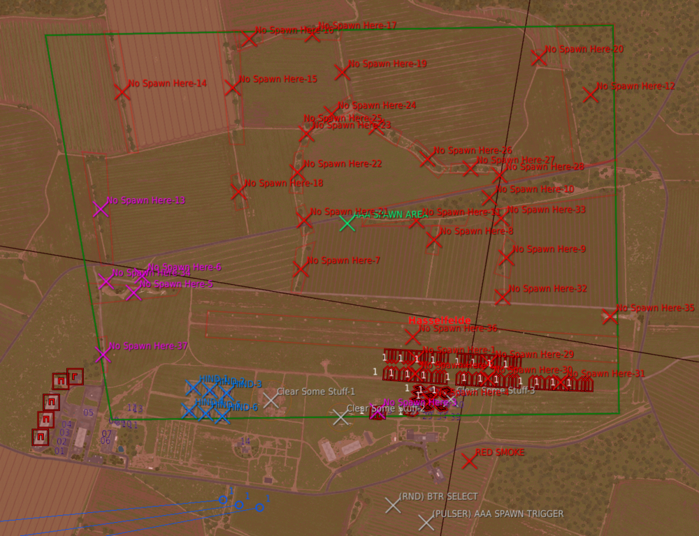 Alright been playing with this for a week may I suggest a (hopefully) small tweak! When searching for the nearest clone zone to attach a noSpawn zone to, ignore clone zones that don't have the rndLoc attribute active. This way you can still have smaller, more traditional clone zones inside a large area clone zone without the risk of noSpawns attaching to an unintended zone or failing to attach due to being outside of the nearest zone found. Here's a screenshot of what I was trying to do. In this example noSpawn zones 5, 6, 13, 34, 37 (in purple) on the left side of the green spawn area try to attach to the cloner HIND-1 (blue) and noSpawn-3 buried at the six o'clock position tries to attach to cloner HIND-3. Since the noSpawn zones are completely outside the nearest zones found they are ignored/rejected. The AAA SPAWN AREA cloner uses rndLoc, the cloners HIND-1 through HIND-6 on the pads do not use rndLoc. An unintended side-effect of being able to create a huge spawn area for sure! My thinking was if noSpawns only work if rndLoc is active, no reason to attach to zones where rndLoc is not active. Maybe more complicated, but another way to do it would be to (optionally) allow the positive linking of noSpawns to a specific cloner by direct reference to a specific zone name in the noSpawn attribute field. Then could still use rndLoc in other zones as needed. ps..If you can't tell I hate trees, but not so much that I want to cut them all down this works perfectly even with all those zones and tons of units! null null -