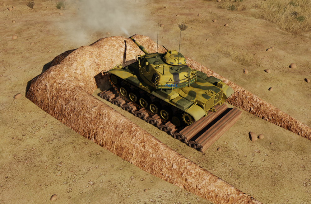 Could lay down some static objects to give the tank a little boost. "M92 Pile of Woods" under structures works ok-ish it gets the M-60 just high enough to fire over the lower points of the berm.