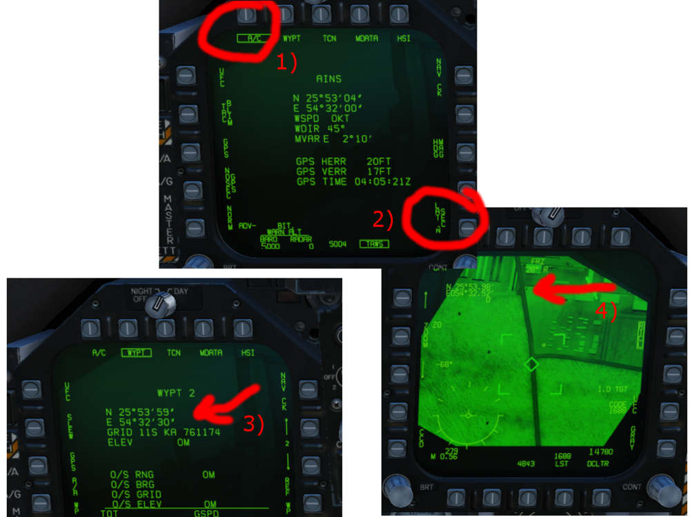 Changing the coordinate system seems mandatory if not just finding the target from F10 map and then zooming there with TGP. The coordinates do point close to the target. As seen in that video and this picture that just made from the mission area 1) Select A/C in HSI data page 2) Change format 3) Coordinates given in mission will work now if make a new waypoint 4) TPG shows different numbers than waypoint now, but you get the target here in mission Edit: This image is took from mission editor. Pay no attension to waypoint number that happens to be 2 in the image. Also no target is show because of this.