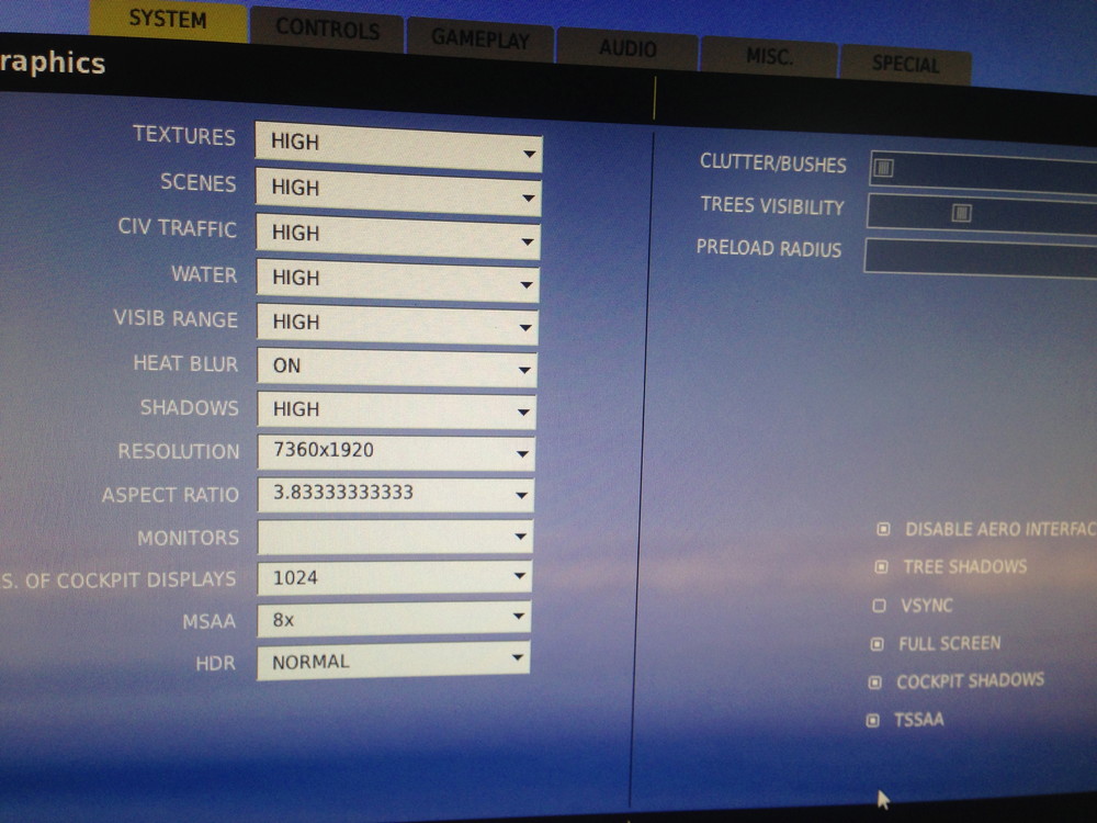 Hey Guys, I was able to get my Nvidia Surround setup on my three monitors. I am using 5760 x 1080. I set DCS to 3 screen and 1024 every frame, MSAA to 4x, and HDR to Normal. I also checked off Disable Aero, Tree Shadows, Fully Screen, Cockpit Shadows, and TSSAA. I left VSync unchecked. I also made sure that VSync was unchecked within the NVidia control panel. I was able to get in game and by using FRAPS noticed that I was getting 10FPS. I tried using SoftTH but I was getting an error when I attempted to start DCS. With my system shouldn't I be getting more FPS? Thank you, Steve
