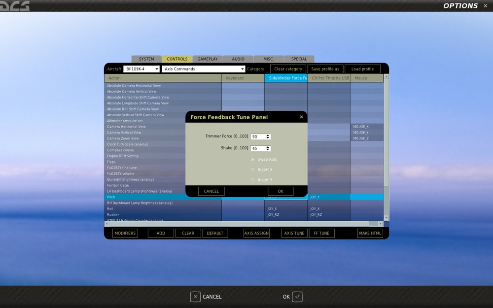 My joystick is a MS sidewinder FB 2. In some DCS modules, swap axis in FF tune must be on for this joystick. For the 109, seems should be off. Anyone ?