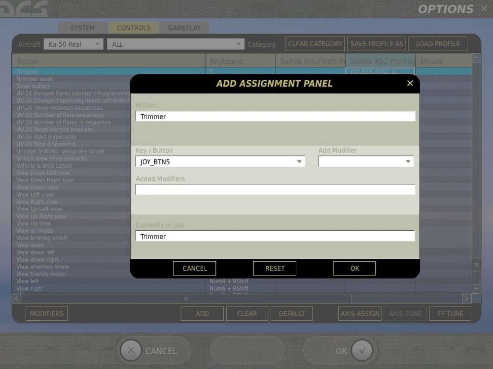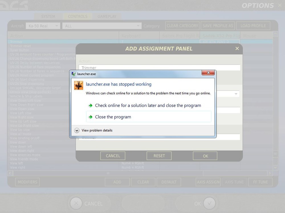 I try uninstalling and reinstalling the Saitek drivers. I also redid the stick/control commands in the DCS options-controls menu, still no joy. I add some picture to help illustrate what is happening. I add a picture of the joystick so you know what button I'm referring to. Here is the main DCS controls menu. The trim reset is currently set to JOY_BTN5 + JOY_BTN7 as a modifer. This works good. Next is a picture of the dialog box, where a joystick button can be assigned to a BS control, in this case which is JOY_BTN5 to the trim. As soon as I hit the 'OK' button to make the change, I next get a program crash as you will see in the picture. I have checked and double checked the X52 Pro. There seem to be no problem as everything else is working very flawlessly. Does anyone please have any suggestion?