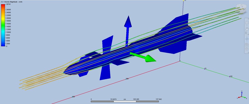 Hi everyone, the reason for this post is my will to start an initiative that will perform a Computational Fluid Dynamics analysis of the R-27 missile family, so that we can provide the developers with the results in a scientific and transparent manner. I have done some very basic exploratory research using Autodesk CFD software. It's fully functional for a trial period of 30 days, but can be used multiple times (instructions upon request in PM). The 3D model was created in Catia, but the CFD software accepts many different formats. I would like to ask for help from any people that are knowledgeable in this area, people that are good in 3D modeling and basically anyone else willing to contribute, to help me out in setting up proper wind tunnel analysis and results post processing. I do have a Master's in Engineering, but I got my degree some time ago and I am quite rusty in fluid dynamics, meaning I suck at it. Here are some pictures from the initial trials. Figure 1.0 - velocity graph Figure 2.0 - airflow