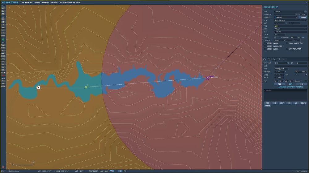 ADDENDUM The problem seems to be linked to the altitude of the target (area). Above a certain altitude, the AI will not attack, even if the terrain is perfectly flat. Let's agree that a lake is perfectly flat. In the first image, the lake is at 2077 m, and the AI will not attack In the second image, the lake is at 2077 m, and the AI will not attack In the third, the lake is at 1078, and the AI attacks as expected I have tried many more altitudes, and 1462 m doesn't work. It seems to be tied to altitude somehow. But it's all very random. It may be linked to the altitude at which the AI is looking to drop the Bk90's. As the area nears 1200 or 1300 meters, the AI starts behaving erratically. In the 1148 meter test, over a lake (img 4), the attack is done very late, like under 2 km range, as opposed to the normal 7 or 8 km over flat terrain. Sometimes, the AI won't drop both Bk90's (which it's set to in the mission). Heatblur should look into this. -