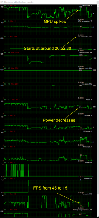 Hey I'm still chasing a very odd problem that I'm having. I got my Zotac RTX 3080 "Gaming" a few days ago, which has replaced my 1080 Ti. I have used DDU to remove all old drivers and installed nVidia from scratch. The card is mounted with 2x 8-pin cables, as you can see here. My problem however, is really really odd. While playing DCS in VR (which is what I've used basically all the time since getting the new card as it's here that I have the problem). So what is it? Well... As you see from this image, the card will suddenly do something which doesn't make any sense at all. It will: spike the GPU at 100%... while lowering (!) power consumption by 1/3 while increasing (!) demand on the Bus and the result is a net loss of fps by 2/3 (from 45 to 15) (Disregard when the graph shows 0 fps as that's when I have the game in the background, those moments are "normal".) It will stay like the indefinitely, or until I pause the game--which doesn't pause the 3D rendering and VR! After a 5s or so in pause and task switched to a different program, the curves will bounce back and I can go back to the game, for a while until it starts again. I have also removed all Oculus software following the correct procedures, and reinstalled that too. I normally use the Quest 2 via a USB cable which is more stable than going by Wi-fi. But I have also tried over Wi-fi, and I have exact same behavior there too, i.e with the VR headset having zero cables going into the PC! I've stressed the card running MSI Kombustor for 15 min, and it's stressing the card way beyond anything DCS does even in VR, with higher average GPU % load and much higher average Power (W) usage. I've also started OBS and some other tools simultaneously to push the card even further. And it's doing this without a hiccup. Here's an image of this test I have also run DCS on "pancake" (i.e, not VR) and have zero problems when used like that. The forums are void of this problem as far as I've been able to find. Even though I really don't think the problem is related to my PSU, just to be sure, I have today replaced my old Corsair CX750 with a brand new Cooler Master V850 Gold V2. And I still have the same behavior... I would normally expect the W to go hand in hand with the GPU %, but it doesn't. And the behavior is completely random; I'm not doing anything special, or going to a "dense" place. It can happen with me sitting there not doing anything. That means that the load on the CPU and/or GPU aren't changing. I have tried bumping up the fans to max to see if it was correlated with temperatures, but nope. Does anyone have a clue as to what this is? Anyone? Anything? Help is MUCH appreciated.