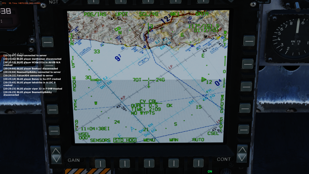 Sometime it'll take awhile after I had been flying sometimes I'll notice it right when I start the aircraft and performing an aligning, it simply pops up in some cases. Shows up on all MDI/AMPCDs when using the HSI, the TGP and just the normal TAC and SUPT screens. You can barely see it there but you can notice that the bottom half is shaded. The shad also seems to intensify. I have no idea what is causing this. dcs.log -