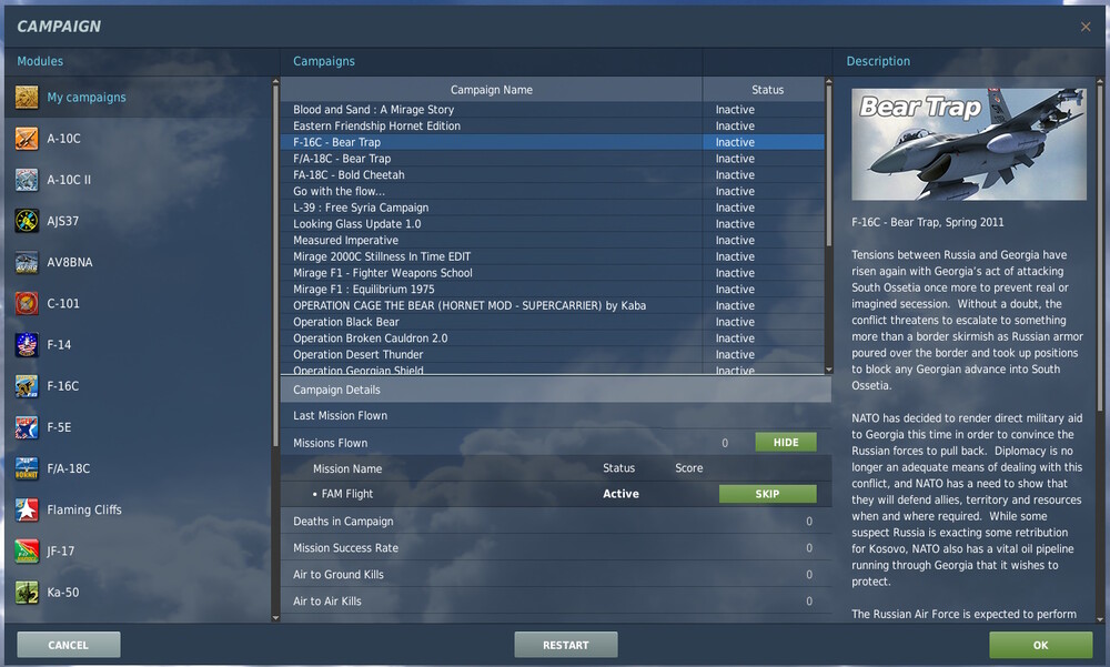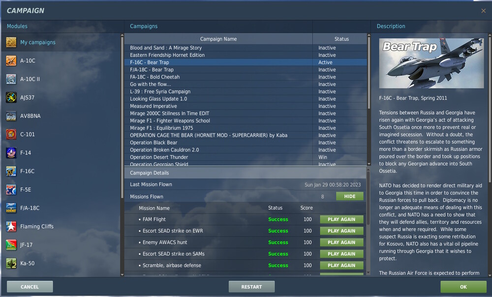 Seen on Open Beta v2.8.2.35759 Was working ok with OB v2.8.1.34667.2. Not sure (don't remeber) about OB v2.8.2.35632. Problem description: When I enter the CAMPAIGN page, the status of all campaigns is set to "INACTIVE", including for capaigns I've completed and the ones I'currently played (see attached "Campaign-Bug.jpg" picture). Procedure to reproduce: Just enter the CAMPAIGN page, any module Tab will do (it is not restricet to "My Campaign" tab). (WORKAROUND) : Click on one of the other module campaign's tab and then come back to the previous one then the campaign status appears to be correct (see attached "Campaign-Ok.jpg" picture). Exit and Enter the Campaign page to see the problem again. I've included my Logbook file (should it be useful). logbook.lua