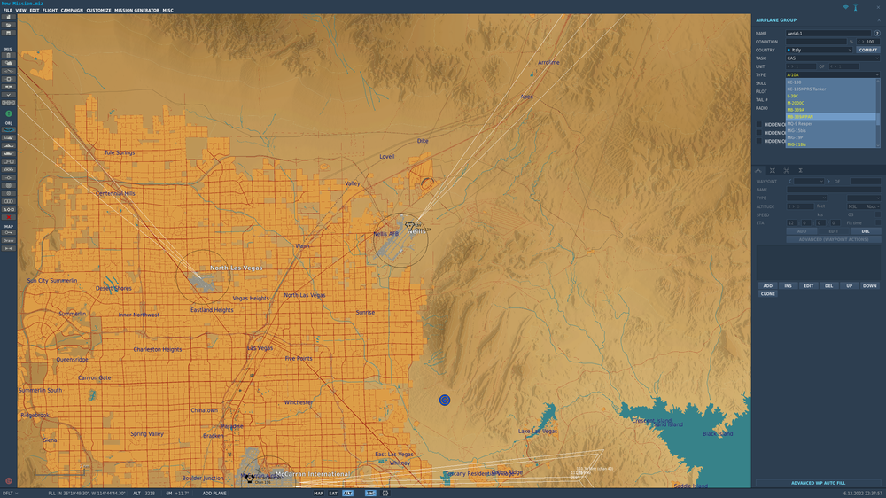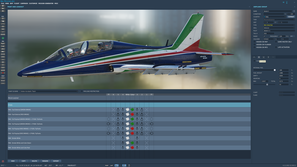 Sinceramente sono sempre piu' confuso... Comunque, se vuoi volare con 339 PAN puoi creare una missione con l'editor: Scegli una mappa, ci piazzi sopra un aereo, poi setti come COUNTRY: "ITALY" e TYPE: "MB-339A/PAN" (vedi pics). Puoi personalizzare la livrea dal menu dell'armamento, ma quella PAN dovrebbe essere il default.