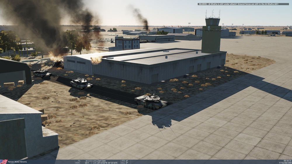 Played for 2 hours already, Air Battle seems to work good, The Resupply to Al Dhaffra also worked like a charm, the Base Defense seems a bit lacking, I stationed a Bradley Squad and a MBT A1 Squad at Al Dhafra, The Bradleys stay on the wrong side of the Airfield not reacting to Attack from the Red MBTs as it seems, and my Abrams hide behind my Airfield buildings trying to shoot through, but wrecking my Airport instead. see Picture. PS: Attack is still in progress, but i have to pause and go sleep, then i will launch the ground pounder. Enormous fun for my weekend, thanks a lot! Edit: A few minutes later, my MBT proceeded and stopped the HQ invasion:thumbup: