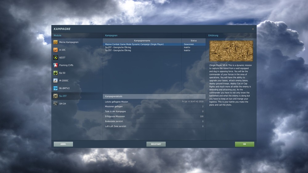 Hey, i've won the campaign. Took only 90 minutes. one playtest, one save load. Should i have won by capturing Al Moktuim (not even sure my last Surviving Abrams did it)? Or is it supposed to end after said 2 hour Limit? Additional Info: -Edited the DCS missionscripting file to deactivate 2 sanetize lines -Changed all the Directories in the Campaign File to match my D: Games Drive -Little Typo in Mission Name <Mas"S"ive> and description Text <man"A"ge> -Made note to myself to re-edit after DCS Updates