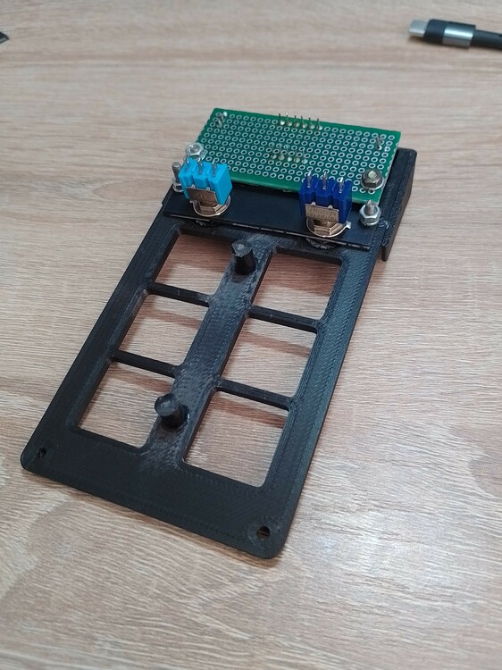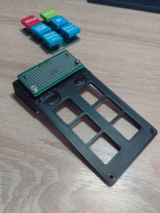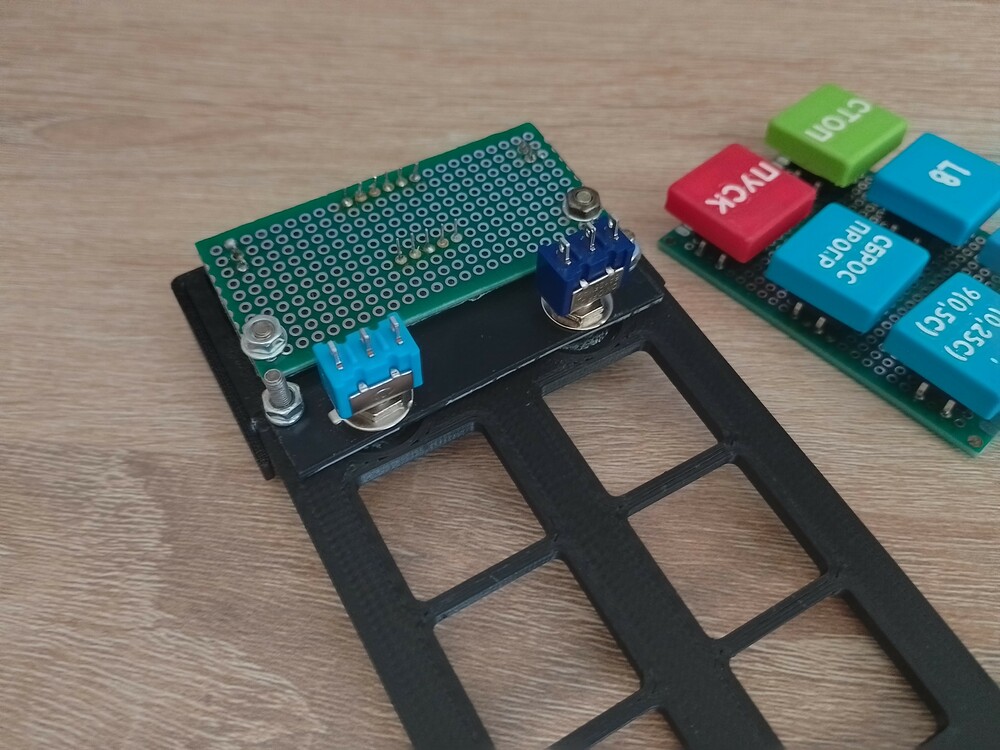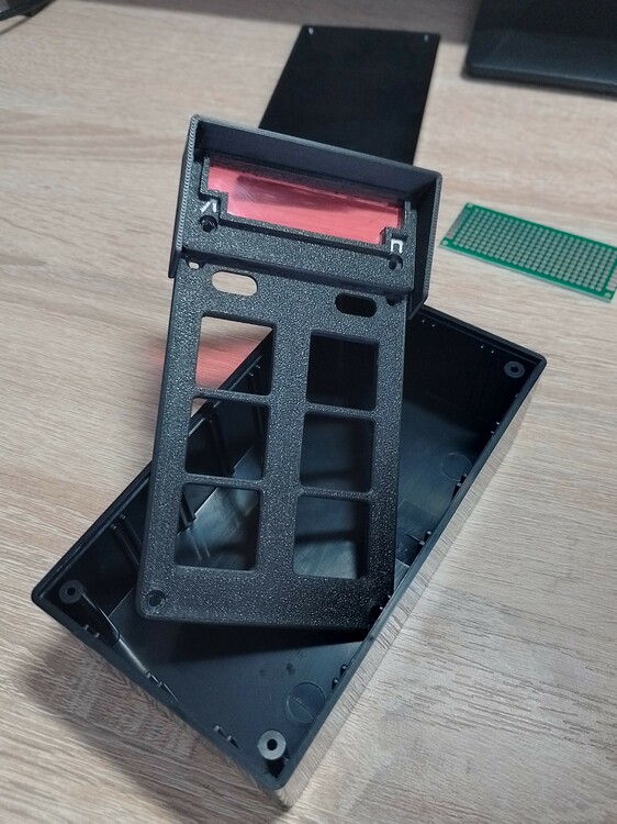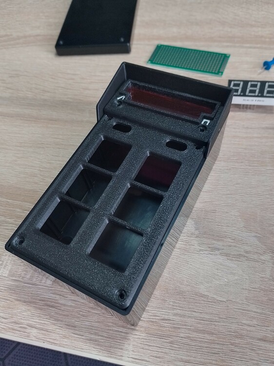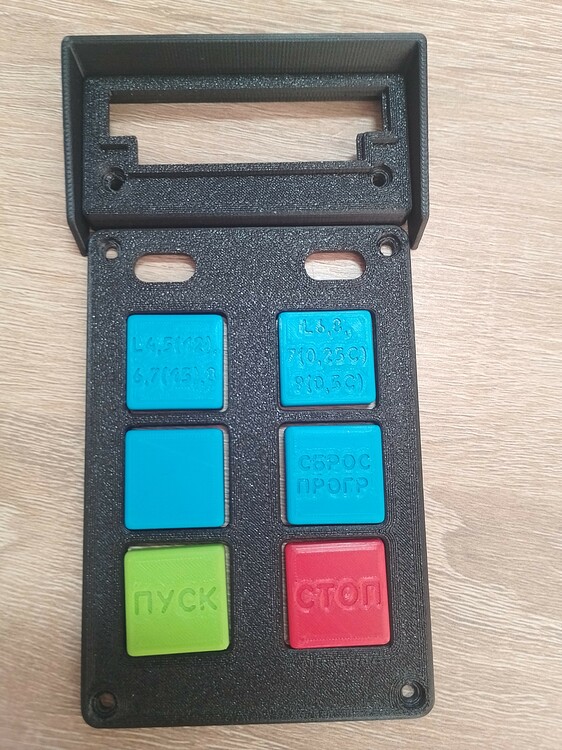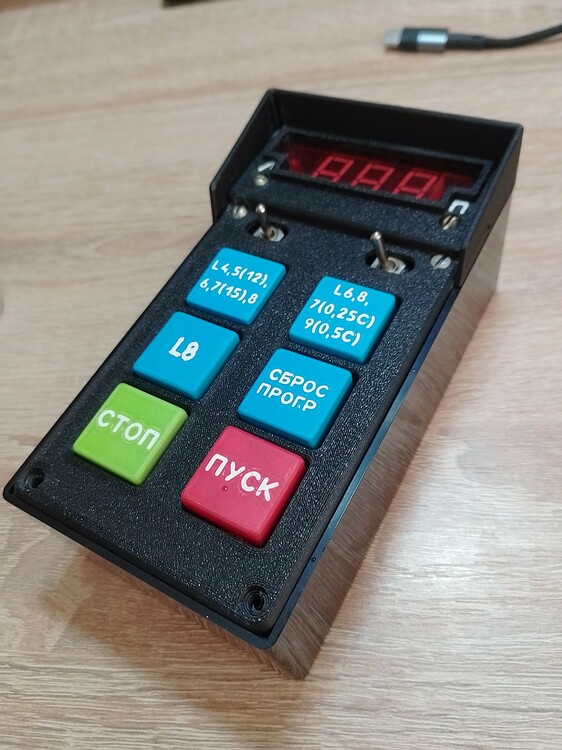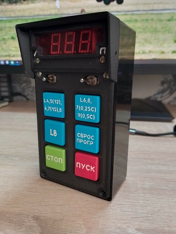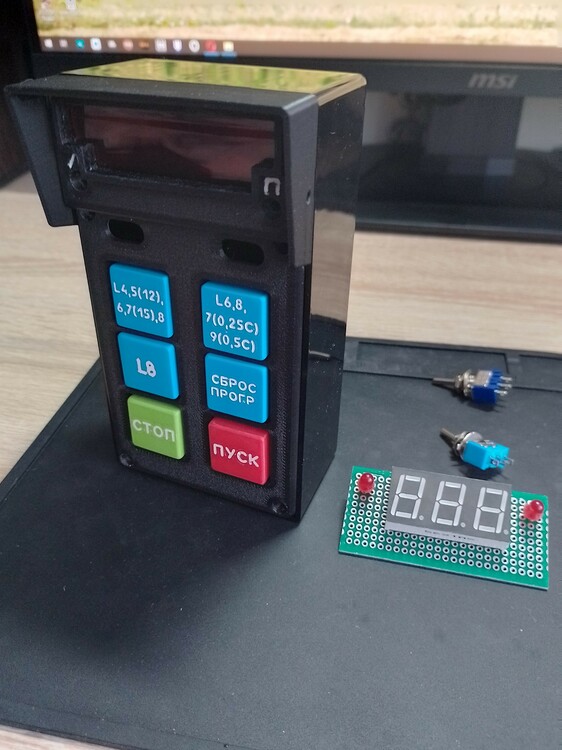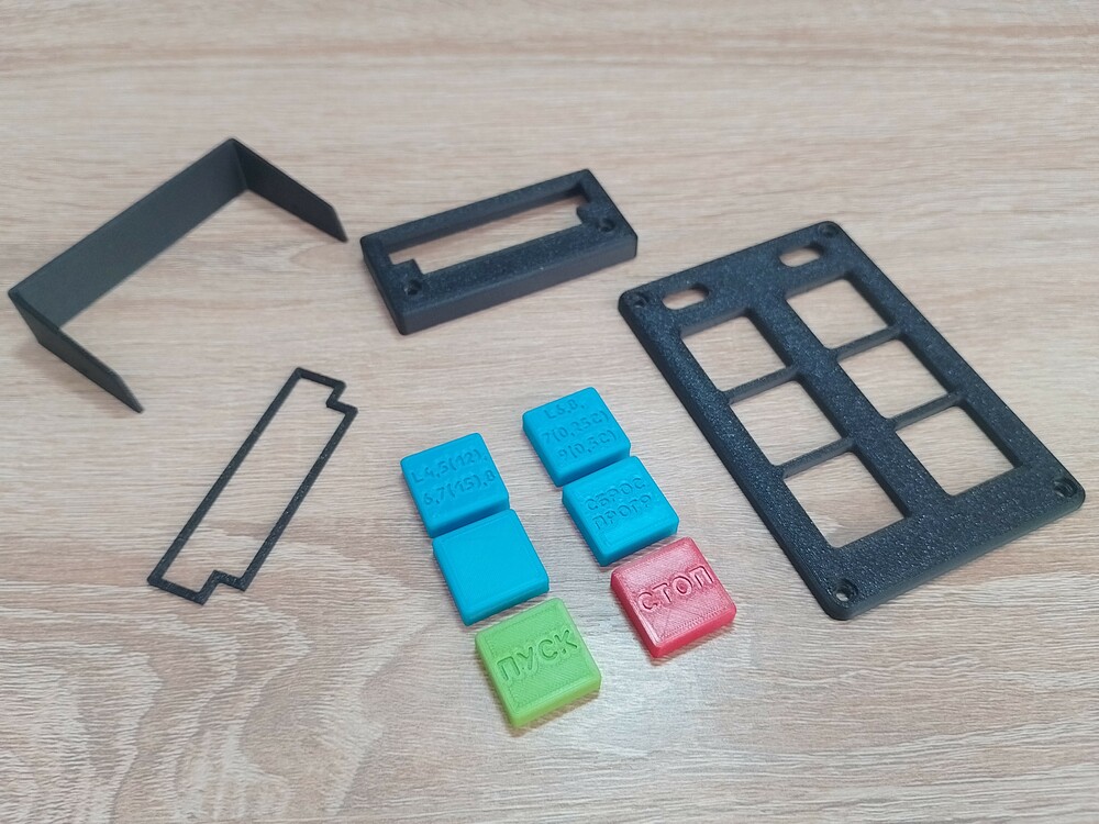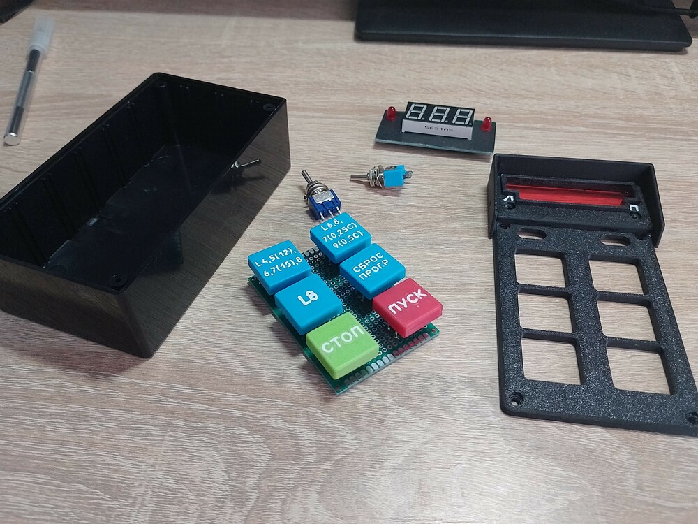 Не сфоткал момент прикрепленной платы с кнопками, крепится на 2х винтах. В сборе выглядит вот так... осталось вмонтировать плату Ардуино Нано и драйвер для цифровой панели, внутри помещаются свободно, место позволяет. И останется распаять. До этого схему собирал на макетке, работает. Продолжение следует...