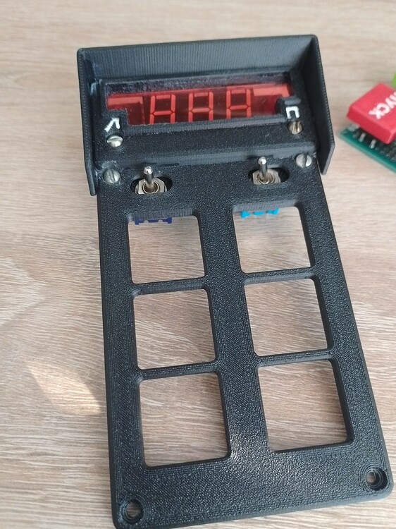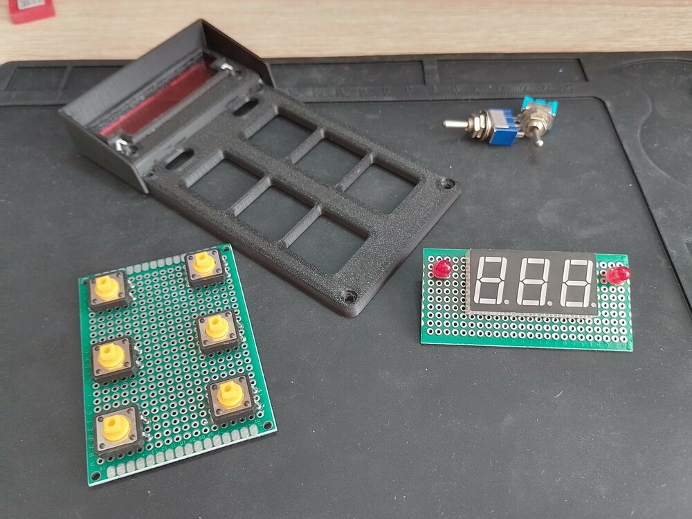 Собрал на плате кнопки купленные на алике, тумблеры там же, 7и сегментный дисплей так же, ну и общий вид готовых кнопок. И небольшой монтаж этого. Прикрепил плату с цифровым индикатором и тумблеры на основу. Основу (лицевая часть) собрал (склеил) в единое, был один нюанс, что в коробку не вмещалось по высоте несколько миллиметров, пришлось подтачивать и подгонять по месту, в итоге вышло идеально.