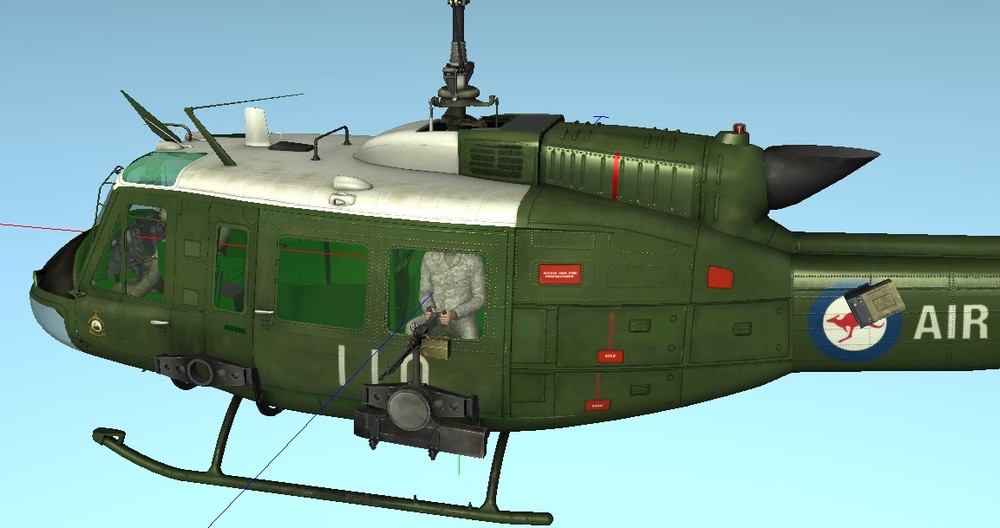 The Army Ft. Rucker skin doesn't have the right textures in the liveries folder, it only has the red/white Bell/Textron textures. The Australian Helo's description.lua's are missing these lines {"civ_uh1_main_dam", 0, "civ_uh1.bmp", true}; {"civ_uh1_main_dam", 2, "civ_uh1_spec.bmp", true}; {"civ_uh1_tail_dam", 0, "civ_uh1_tail.bmp", true}; {"civ_uh1_tail_dam", 2, "civ_uh1_tail_spec.bmp", true}; {"civ_uh1_main", 0, "civ_uh1.bmp", true}; {"civ_uh1_main", 2, "civ_uh1_spec.bmp", true}; {"civ_uh1_tail", 0, "civ_uh1_tail.bmp", true}; {"civ_uh1_tail", 2, "civ_uh1_tail_spec.bmp", true}; Before I added them the textures weren't showing in ModelViewer.exe. I added them and the textures appear fine now, I haven't tested in game but if it looks OK in MV it should be cool in game. That is if those lines are meant to be there at all.