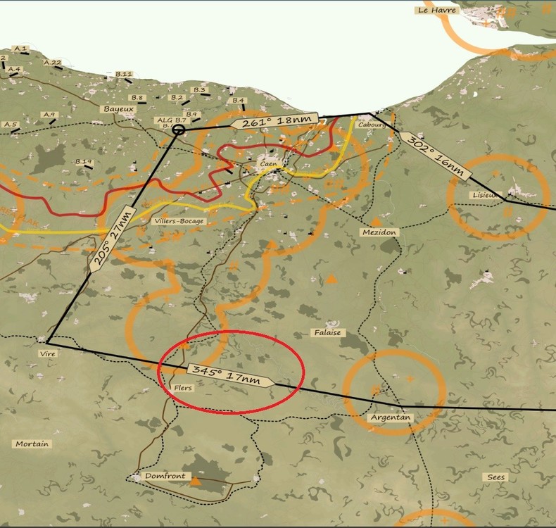 1. In mission 5 in the kneeboard drawing of the map the route between Vire and Argentan has a heading of 345 degrees which is incorrect. It should be roughly 97 degrees.