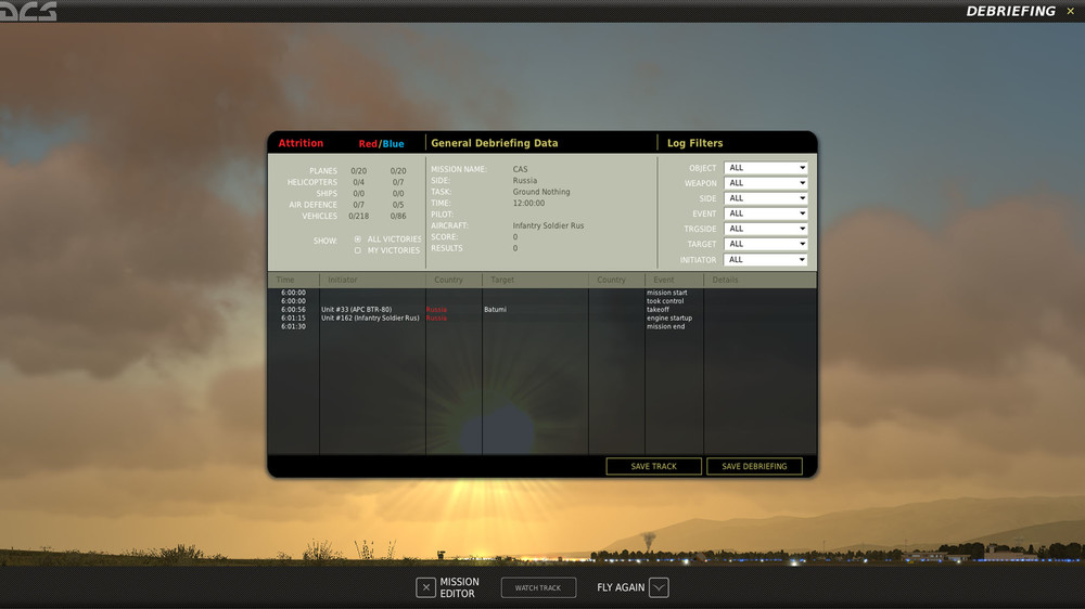 I have major problems as well. It seems like simple missions without triggers are ok. More complex missions, which worked with 1.2.4, crashes at startup as described earlier. If you test them in the mission editor you can see som really strange activity in the debriefing. Units on the same side shooting on friendly troops, units you dont recognize shooting at friendly units. Even ground units taking off??? Also one interesting thing is the times are all screwed upp. In the debriefing I have set the start time to 17:00 but the debriefing states something shooting at 12:xx? ANd on the other mission when it should start 12:00 it starts 06:00!? I think something really strange going on here. Some screen shoots on the mission debriefing Appreciate the help. -