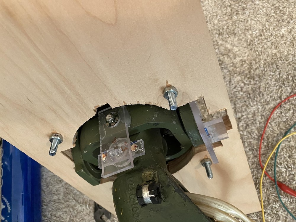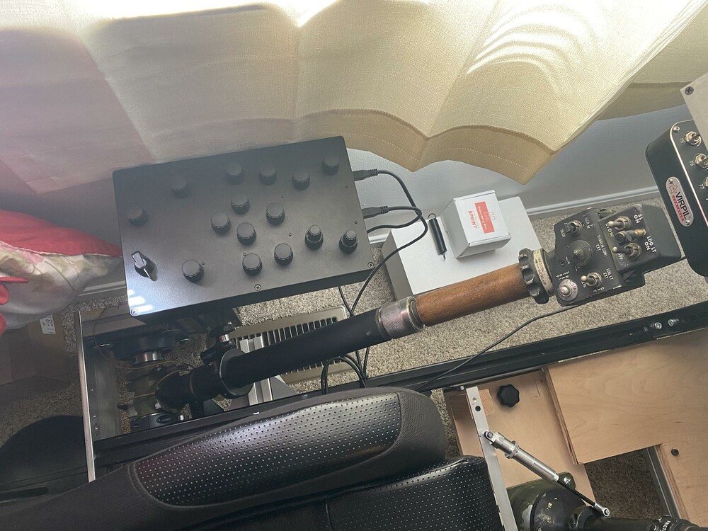 I've been asking a few questions about converting real huey controls for use with DCS. I figured I'd share a few images of what I have so far. Big thanks to yogi149 and EvilBert VR. If you guys see this thanks for answering all my questions! Cyclic and Collective are the real deal. All axis and buttons are working (except landing light retract, that is eluding me at the moment) There is no physical idle stop on the throttle for now, but I faked it in the software using joystick gremlin to make virtual buttons at the bottom of the throttle axis. I had to remake the collective mount as mine didn't come with an original. Huge 40mm bearing from amazon and a shaft collar from McMaster Carr did the trick. Motorcycle steering damper helps smooth out the movement. The damper can be detached with a threaded knob and then the whole collective can be flipped up behind my shoulder to allow room for my Virpil throttle to slide into place. Everything is done with hall effect sensors and two small magnets. Seems pretty precise so far. However I'm looking to add some friction or damping to the cyclic as its currently just free floating. Better than fighting springs but holding the weight of the stick gets tiring. That's what I have so far. Up next is to clean up all the wiring and mount the Bodnar board in an enclosure. Also going to make a huey specific button box at some point. The goal is to do a full start up without touching the keyboard or mouse. Thanks for looking!