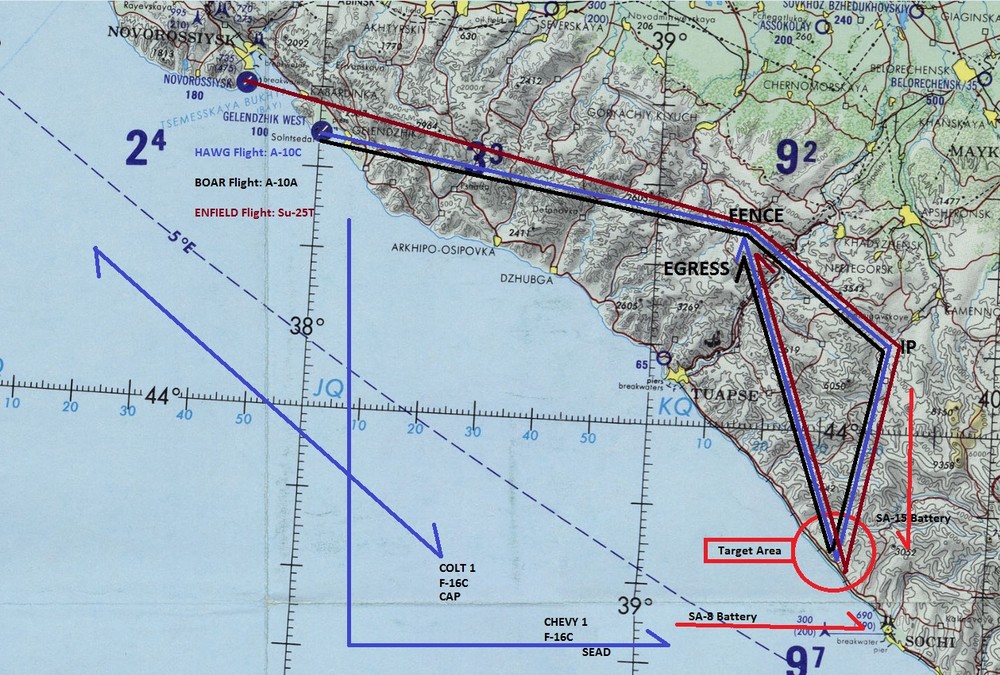 Go Ugly Early: 1-01 Uncivilized Times No time for pleasantries gentlemen. As you know the situation here in Krasnodar has continued to degrade culminating in the shooting down of USAF refugee aircraft over Abhkazia. The Abkhaz have continued their push into Krasnodar Oblast, assumingly, under the pressure of the PNUP rebels. If you were watching the news last night, you know that the several rockets were launched into Krasnodar, Maykop and Novorossisysk. We are in the process of bringing in additional Patriot interceptors with additional ground forces, but it is going to take time to relocate them from bases in Germany. The Abkhaz have boasted about loading these missiles with biological and chemical warheads. SatComm has confirmed the Abkhaz have brought additional rockets forward along with fuel trucks this morning. It is estimated these missiles could be operational by 0600 and judging from the increasing aggression and continued advance of Abkhaz forces against the agreed cease fire line near Tuapse, we have to conclude that Abhkazia intends to use these weapons. |------------------------------| Threat Assessment: |------------------------------| SAMS: Various IR SAM's such as SA-13 and SA-9. The Abkhaz forces do have extensive numbers of SA-8 and SA-15 mobile SAM platforms and have erected a net around the town of Sochi and the Sochi-Adler Airbase. Intel suggests that at least some of these platforms may cover the SCUD sites. Pay attention to your RWR and be sure to egress WEST off target. AAA: Multiple radar assisted ZSU-23 Air: So far, the Abkhaz have kept most of their fighters on the ground thanks to the efforts of the 492nd and 493rd during the past two weeks. However, it is estimated that the Abhkaz still have around 12-15 fighters of varying quality and type. |------------------------------| Allied Support: |------------------------------| COLT Flight: F-16C x 2 CAP CHEVY Flight: F-16C x 4 SEAD FORD Flight: F-15E x 2 Strike if needed |------------------------------| Default Loadout |------------------------------| HAWG Flight [A-10C]: AGM-65D*4 and GBU-38*2 and CBU-87*2 and Rockets M151*7 and TGP BOAR Flight [A-10A]: AGM-65D*2 and CBU-97*2 and CBU-87*2 and Rockets M151*38 ENFIELD Flight [su-25T]: KAB-500r*2 and Vikhr*16 and Kh-25ML*2 and Rockets S-8*40 and LLTV Revision 1: Changed Su-25T flight from AI to client [my bad! sorry!], fixed various SAM locations and altered SEAD flight loadout. Mission now includes flight plan and target pictures. Go Ugly Early 1-01 Uncivilized Times.miz