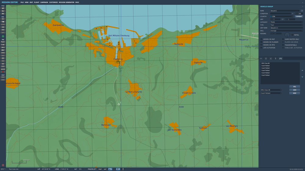 Hi, HM - it should like be ... 1) configure a train 2) set minimum 1 waypoint the train will cycle between waypoint 0 and the last waypoint LCTRL + F12 toggle civil traffic view MIZ : Normandy, Open Beta - Test train.miz