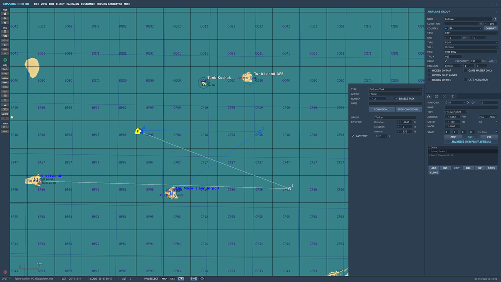 Hi, I don't have the Syria map - therefore I can`t open your miz Maybe this is working Tanker/F18 waypoint 1 - 2 - ABU MUSA F16 - follow the tanker to tanker waypoint 2 F16 - switch to F16 waypoint 1 and land at Sirri