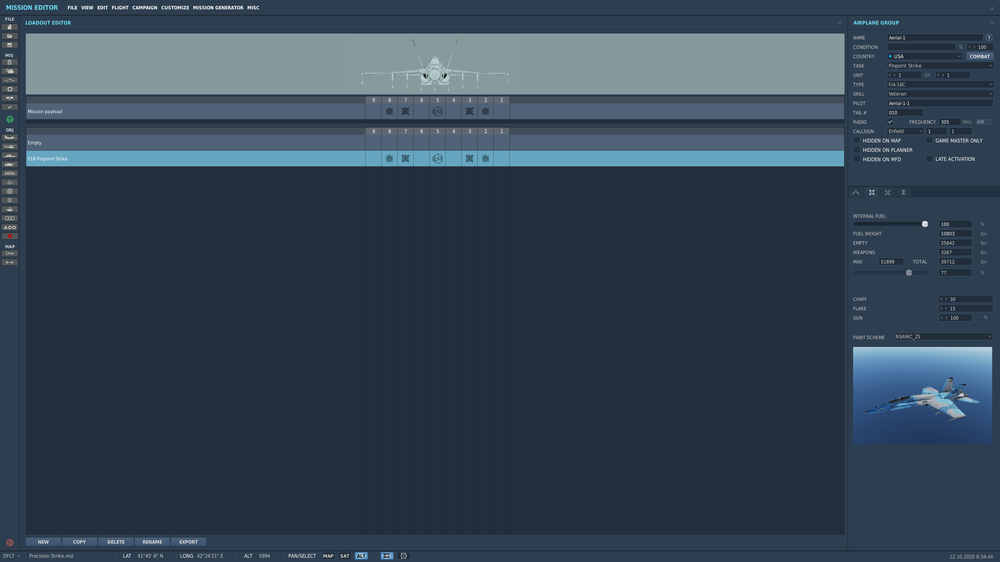 Hi, Wäre hilfreich gewesen, die Mission mit Angabe der verwendeten Karte (Caucasus, Golf, ... ) hochzuladen DCS User Manual EN 2020.pdf Pinpoint Strike. The Pinpoint strike mission task involves detecting and attacking surface targets using precision-guided weapons (also Laser- oder GPS-Guided Bomben). Ich habe im Missioneditor dann nur die Auswahl (?) : Attack Map Object Attack a specific structure or object on the map, such as a bridge, bunker, etc., based on a map coordinate position. Bombing Deliver air-to-ground ordnance onto the map coordinate as designated by the mission designer. Beispiel Caucasus Precision Strike.miz