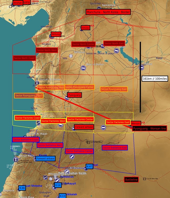16. Korean War would be over by Christmas `50 they thought... But it wasn't. Korean War Server 1950-1953 Syrian map and WWII assets pack required SRS autoconnect: overbychristmas.ddns.net https://discord.gg/DPmTHdJeHf Recreation (not strictly historical) of the Korean War within the DCS Sandbox. DCS has some "limitations" when going for a Korean War recreation, e.g. no Korean map, no B-29 etc. The only adequate assets are the F-86F and MiG-15bis and F-51D. Nonetheless there are possibilities if you are willing to accept some compromises. If you can't, then sorry, this server is not suitable for you. This is a PvEvP server. In this scenario North Korea managed to bring enough ground attack aircraft to the airfield K-23 at Pyongyang to strike UN troops (for gameplay - not historical). This brings more variety into the game. But still the idea is to fly the missions with real distances // flight times. The distance between (the Syria map equivalent of) Suwon and Antung is 94% of the real distance -> 367km // 228sm // 198nm Distance Suwon(eq.) to Pyongyang(eq.) is 102% of the real distance -> 229km // 142sm // 124nm. So don't forget to take some bags with you. Of course this is a game and not everyone likes the idea to fly very long distances. For this reason and even more to seed the server, QRF units are available. They are located at the forward airbases, red and blue. The Sabre/MiG-15 QRF slots are airstart slots. 5 minutes south/north of Pyongyang EWR is available, but limited to approximately 100miles around the airfields Antung and K-13. Long range radar available. It uses sectors and is available on demand. Use Coms menu F10 to request a picture, then immediately check F10 menu again for the update. See "Task" section for sector names. AI aircraft fly patrols and attacks. You won't be alone here. AAA can be occupied by players. Placeholder assets are replaced as soon as adequate ones come to DCS. Korean Theatre -> Syrian map Ground troops and AAA -> WWII assets pack F-80C Shooting Star -> L-39ZA F-84 Thunderjet -> C-101CC B-29 -> B-17G B-26 -> Mosquito FB Mk VI (Client) // A-20G (AI) Seafire -> Spitfire Mk IX AD-1 Skyraider -> P-47D-40 F4U Corsair will be added as soon as it is available La-9 Fritz -> Fw190A-8 La-11 Fang -> Fw190D-9 Yak-18 -> Yak-52 Server 23/7, offline for restart 0105utc - 0205utc Mission restart after 12h mission duration Please report mission bugs in discord or here Red Bases: Antung(Hatay) - 147th GvIAP, 878th IAP Anshan(Adana) - 224th IAP Sinuiju(Minakh) - 435th IAD Pyongyang(Hama) - 351st IAP Forward airbase(Shayrat) - 297th IAD Blue Bases: K-8 / Kunsan (Meggido) - 3rd BW(L) K-9 / Pusan East (H-4) - 34th BS K-10 / Jinhae (King Hussein Air College) - 2nd South African AFS K-13 / Suwon (Khalkhalah) - 16th FS, 39th FS, 36th FBW, 69th FBS K-14 / Kimpo (Marj Ruhayyil) - 334th FIS, 49th FBG, VA-55, 800 NAS K-46 / Hoengsong (Kiryat Shmona) - 12th FBS / 3rd BW(L) K-47 / Chuncheon (Sayqal) - 6147th TCG Forward airbase (Rayak) Vulching is not prohibited. It's a pesky thing, but it happened in reality also. There are no "save from being shot" zones Do not disconnect/change slot while in the air. Eject, wait till the aircraft crashes into the ground, then you may rejoin a fresh aircraft or go to spectators/disconnect. There is no stats system. If you want to know whether you killed an enemy, watch him crash. ____________________________________________________________________________________________________________________________________________________________ RED Task Primary task: Survive MiG-15bis: Intercept big ones(B-29) and take care of the small ones(Fighter/Fighter-Bombers). When bombers are in the area of operations you'll be informed. The Big Ones seem to approach NK along the west coast. Quote of Lt Col Aleksander Smorchkov of 18th GvlAP: "I had always taught my pilots that an aircraft like a B-29 was worth all their ammunition." 224th IAP (AI) cover Antung airfield 147th GvIAP, 878th IAP high alt Fighter and Bomber intercept, low level Fighter-Bomber interception. Protect own forces and facilities (marks on the map). The High Command does not allow you to fly south of the line Pyongyang and Wonsan, because there is no EWR coverage south of this line to warn you. You are not allowed to fly over the sea. Pyongyang: 351st IAP attack hostile ground troops at the battleline. QRF@ forward airbase: 297th IAD attack hostile ground troops at the battleline. Radio: 4MHz/Channel 3 for EWR and engagement reports Axeman for the Jets (4MHz) Darknight for the Prop aircraft (Ch3) A forward airbase for repair, refuel, rearm is available at sector factories center ____________________________________________________________________________________________________________________________________________________________ Blue Task Primary task: Survive F-86: Fight MiG-15 in the MiG Alley up to Antung and also Fritz and Fangs between the Battleline and Pyongyang. Protect the Bombers that operate north of the frontline. Their appearance will be announced. Protect own troops. F-86, F-51, F-80, F-84, B-26: Attack Harbors, ammo and weapons factories, depots, etc.. Their positions are marked on the map. Attack targets of opportunity e.g. trains and reported ground troops Radio: Channel 1/A: K-13/K14 Local ATC/Airfield coordination. Use it! Channel 2: K-14/K13 in case you need to divert to the other airfield Channel 3/20/C: EWR and engagement reports Channel 4-18/B+D: Squadron use Channel 21/D for Fighter-Bomber communication Axeman for the Jets (Ch 3) Darknight for the Prop aircraft (Ch C) K-47 Mosquitos on Channel C Mosquitos will search for enemy troops Positions of enemy forces will be shown on the map Crossing the border to Manchuria is prohibited by United Nations - ROE ____________________________________________________________________________________________________________________________________________________________