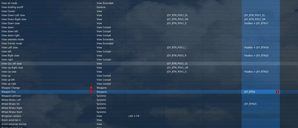 Hi Guys For some time now I have noticed that when loading profiles onto different modules from saved input config files a red exclamation badge that I believe means that multiple inputs have been assigned to that command shows up on random commands. The screen shot attached shows what the issue looks like with the Weapons Fire command that after clearing a duplicate input command in Throttle Category only the one Joystick is input is now being applied but the badge persisting and the bind does not work. There is no rhyme or reason as to what commands will be affected in the different modules it is random. I would greatly appreciate some support solving this very annoying problem. I have done some research on the issue but can't find any satisfactory resolution apart from reloading the module and assigning each command individually which is a prospect that I can hardly imagine considering the number of modules that I have. Very much look forward to hearing from anyone who may have had this problem and has determined root cause and solution. Thanks in advance...