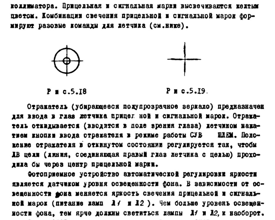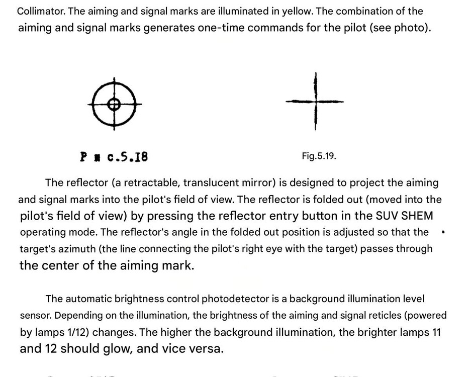 In game we see this broken lines too, they must be solid The use of a broken line in the soviet documentation is a convention for displaying a flashing display mode. It's just that the sight is structurally made so that there are two prisms with stencil and a backlight patch ( source from google open patents),so only two stencil for marks. Description from Mig-29B (export version), public available on internet and almost some post about HMD in the forum has images of fragments from this doc and other, like open patents can clarify it. So, there are only two marks: - signal mark in the form of a solid cross - aiming mark consisting of two solid concentric rings Some Illumination modes: constant burning, flashing at a frequency of 2 Hertz and off. All other types of sights are a combination of the marks of sights themselves and the backlight mode. The "Щ-3УМ НВУ2М" (Schel-3UM NVU2M) were previously used, as can be seen from the old videos in the GDR, but HMD in the module is similar to the "СУРА" (SURA) HMD (the development of the Щ-3УМ, but after the collapse of the USSR), or some kind of late soviet modification like sight НВУ-7 (NVU-7). All this was done at the "Arsenal" plant in Kiev. And the principle of marks formation has not changed much. Images of "Щ-3УM НВУ-7" (Schel-3UM NVU-7)