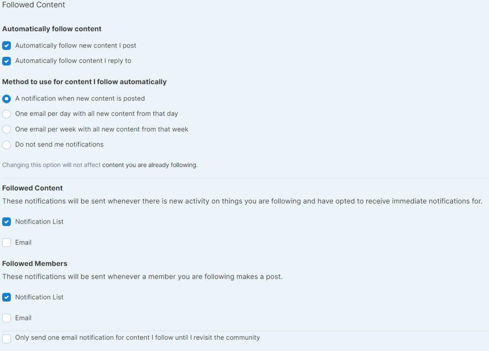 I do have notifications for followed content turned on there. I don't see anything in those settings that distinguishes between followed threads and followed forums, however, and I am receiving notifications about new postings in followed threads, but not about new threads in followed forums. My Followed Content settings are as follows: [Edited because cut and paste didn't work very well. Here is a partial screenshot instead.] -