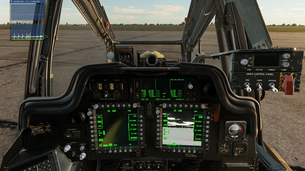 Terrible performance, the same applies to the BS 2 after a recent update, compared to the AH-64D with three sensors turned on and images on three LCD in the simulator, when SHKVAL is turned on, the FPS drops by 20-30 units. In the cold cockpit fps - 60