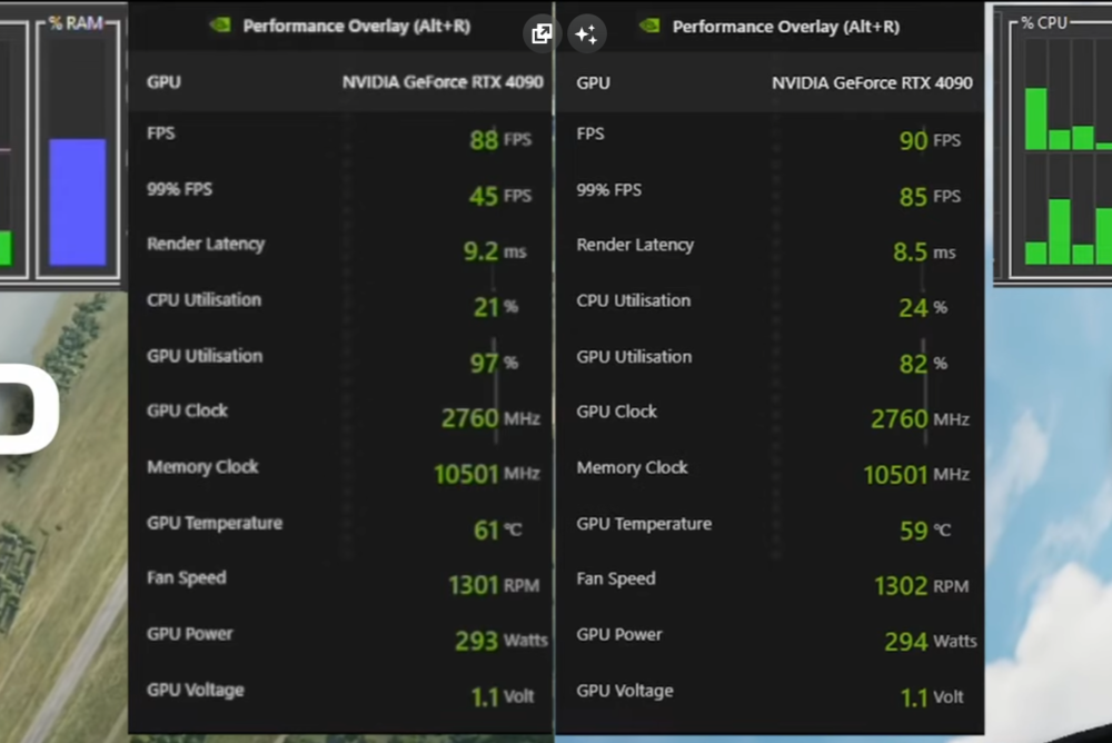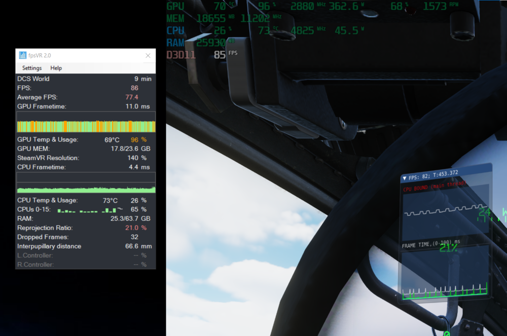 I find it very unlikely. DCS MT is not a heavily multithreaded application. We've only got rendering and main thread separated. Both CPUs show limited utilization on these videos and have some idle cores that could do more work. Also while 13rth gen Intel paired with fast memory (7000MHz+, tweaked timings) can trade blows with 7800X3D and often come on top, that would be a very unusual case if a 12th gen Intel with very slow memory is faster too (IIRC he said Intel had 4800MHz sticks). One very important thing that he is not showing on these videos are CPU and GPU frametimes as measured by VR software. All other tools and metrics are simply not designed to work with VR and may show garbage instead. The DCS "CPU bound" indicator is straight up broken in VR. The Nvidia overlay is also designed for 2D games, on my system it doesn't even show anything in FPS/frametime section when DCS is launched in VR. For example here you have a similar situation I've just snapped on my PC: GPU usage above 90%, but not 100% yet, DCS indicator screams "CPU BOUND", yet the VR software tells the truth. My GPU can't maintain frametime low enough for 90 FPS (orange spikes) which causes FPS drops. The CPU on the other hand sits at very low numbers in the green, there's so much headroom I could swap it for something slower and not see any difference, because here the GPU is the limiting factor. For a steady 90 FPS both CPU and GPU frametime should be below 11ms. GPU is at the limit, CPU is not. And that's what is probably happening on these videos. He's testing the game near the GPU limit. For some reason on the AMD system GPU usage is higher and that's what we can see on the video. Why is that, I don't know. But this means he hits the GPU limit more often, which causes FPS to drop. If your GPU is at the limit, then you are not testing CPUs any more. TLDR: Do not look at FPS when comparing hardware in VR, look at CPU/GPU frametimes. With FPS you simply don't know if the limiting factor is the CPU, GPU or the VR software itself.