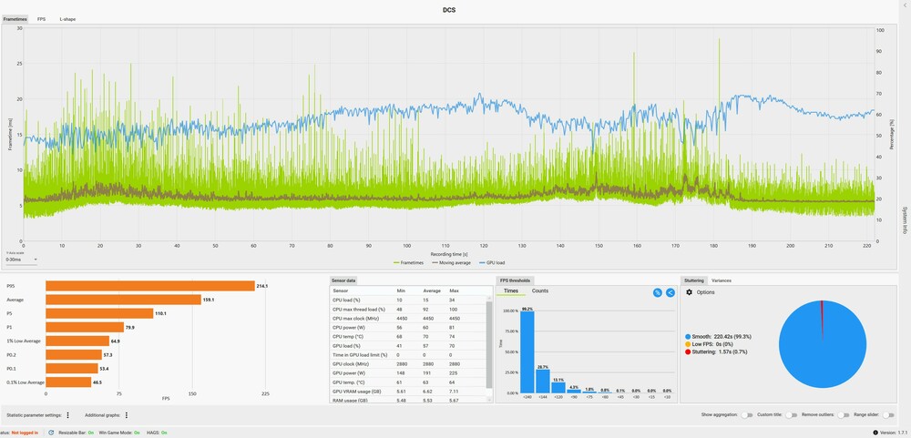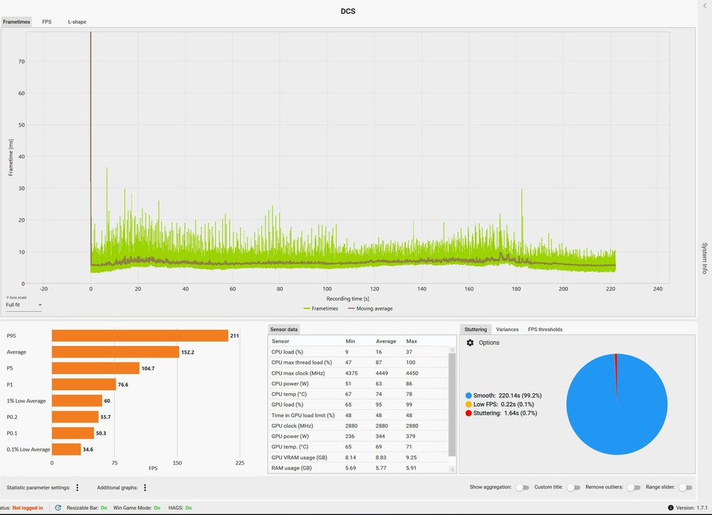 Here's instructions: https://forum.dcs.world/topic/318603-7800x3d-7900x3d-7950x3d/?do=findComment&comment=5166464 And here's my 5800X3D + 4090 + 64GB 3600MHz CL16 RAM, at 4k High preset. Not sure where this huge spike comes at the beginning, maybe because I have HAGS enabled, which normally I would disable for DCS.
