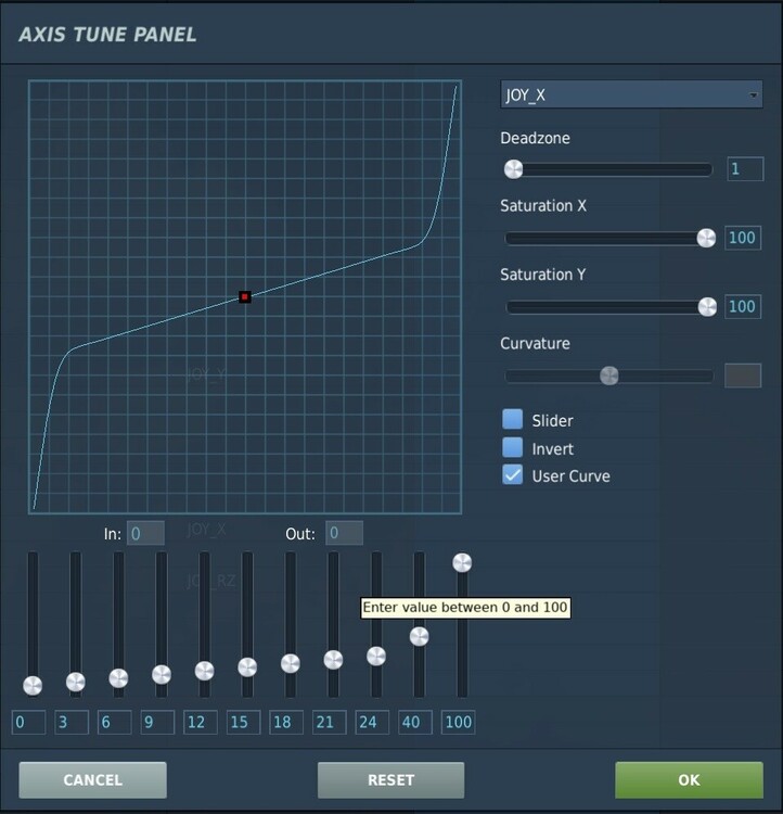 I suggest you use the "User curve" setting. Start at 0 for the left most band, and increase the value band by band by 2 (or 3 on my attachment) as you go step by step to the right. The last slider (on the right) should be on 100%, and the next to last one should be tried and set with the slider so that the curve is smooth where it bends upwards. If still not enough "dampened", try 2 for increment (0, 2, 4, etc.) instead of 3, like on my pic below. By the way you don't have to fiddle around with the sliders, you can click into the fields below and write in the numbers with the keyboard directly. With this method you maximize the length of shallow part, but on the edges of the movement range you still can achieve maximum/original slew speed for both the FCR as well as on the SA page, for quick/coarse slew. You can play with the deadzone too, with a Deadzone of "1" I just wanted to avoid the cursor being moved inadvertantly when depressing TDC to designate something. If it's not enough, you can try 2 or 3. (However I do have the TDC slew upgrade on my TM HW Throttle ( click here to see ), not the pretty much useless original "nipple"...) Setting 20 for deadzone seems a bit overkill for me, you pretty much loose the rather fine middle part of the TDC movement in my opinion.