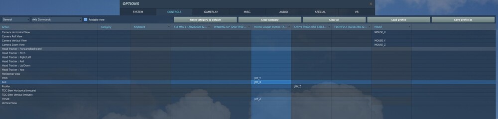 I rebuilt my pc (mainbord, graphics card, cpu and memory) to a more current standard and used my previous Win10 install which works fine, after a re-buy of a product key. The issue I'm having is that all planes in DCS (standalone version) roll hard to the left when I enter the active 3D world in flight. I checked the controller setup: nothing strange there, although I had to remove some none-controller entries (like my Winwing ICP). I also checked the general roll curve: nothing strange there, it's a straight diagonal line with a dot right in the middle. Of course I re-calibrated my Cougar, but that didn't solve it. I checked BMS 4:37 and all is ok there. The screenshot is from the DCS general axis options page. Any idea's?