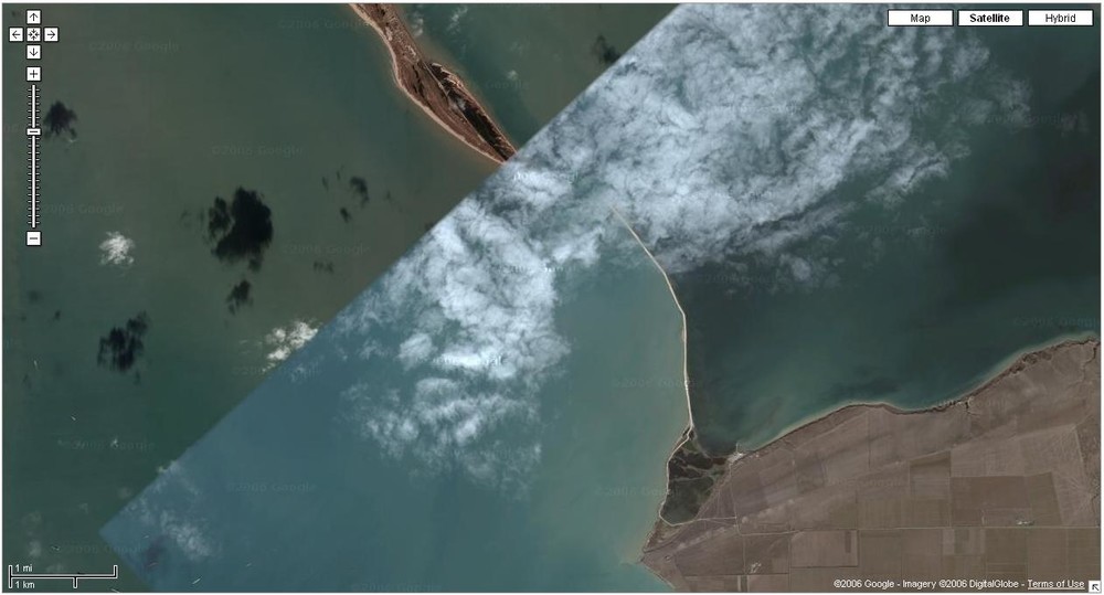 Ещё фотка Вот фотография насыпи (хорошо видна на второй фотографии), ведущей к косе "Тузла" и преграждающей путь волнам, разрушавшим русский берег (в Lock One, который я видел, её нет и вообще коса "Тузла" плохо проработана (просто светлозелёный многоугольник)):