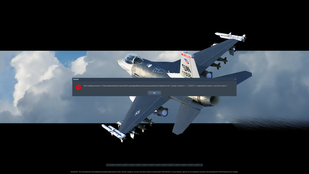 Hi everyone, I just ran into a problem after saving and attempting to load a mission I've been working on... Never had this happen before, but now I'm unable to even edit the mission or load it at all. The error I received was: Error loading mission "C:\Users\Adrian\Saved Games\DCS.openbeta\Missions\Caucasus\Chemical Reaction.miz": [string "mission = ..."]:13175: '}' expected (to close '{' at line 2) near '['I've attached a copy of the mission and a screenshot of the error. When this error occurred, I believe it was right after modifying a trigger, deleting an entry. If someone can have a look, I'd greatly appreciate it! Thanks, Adrian Chemical Reaction.miz
