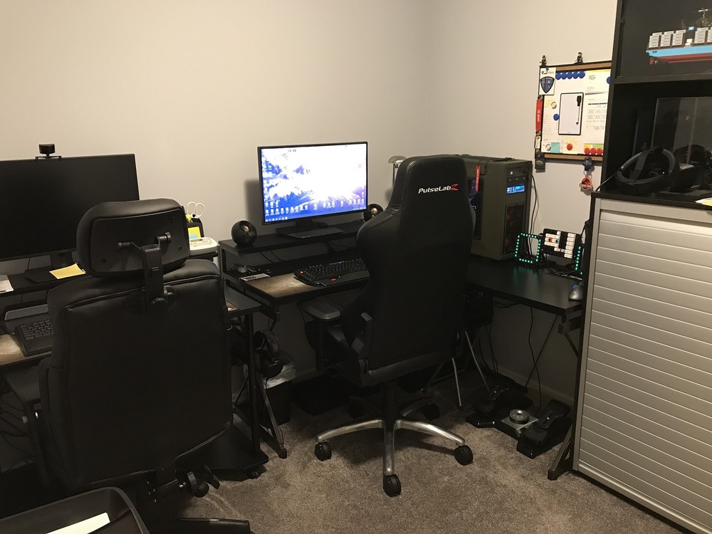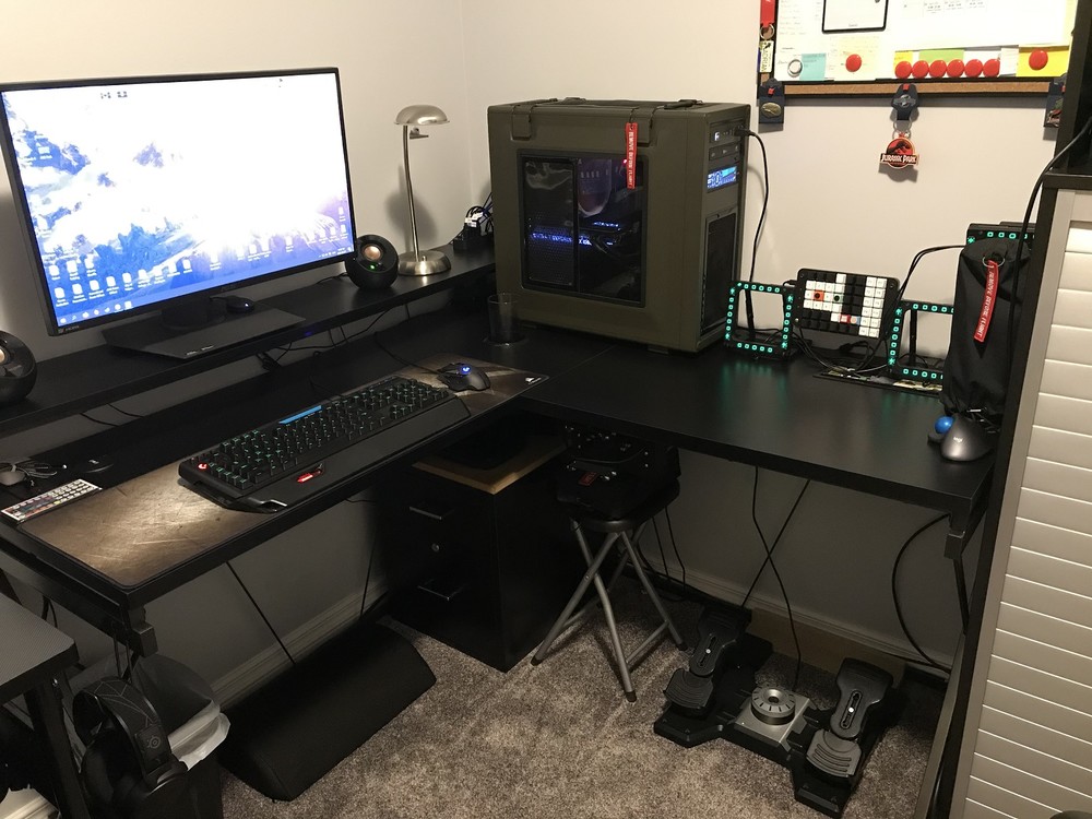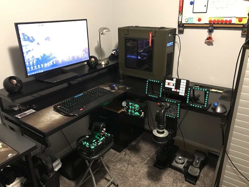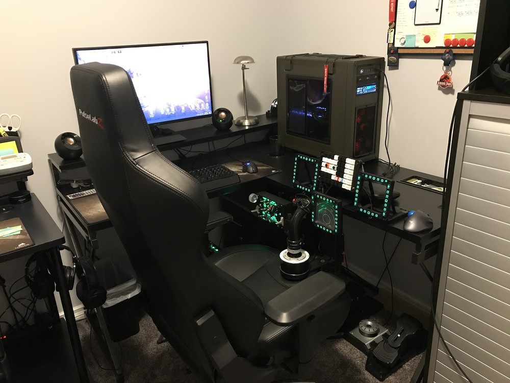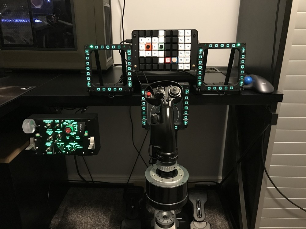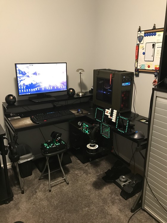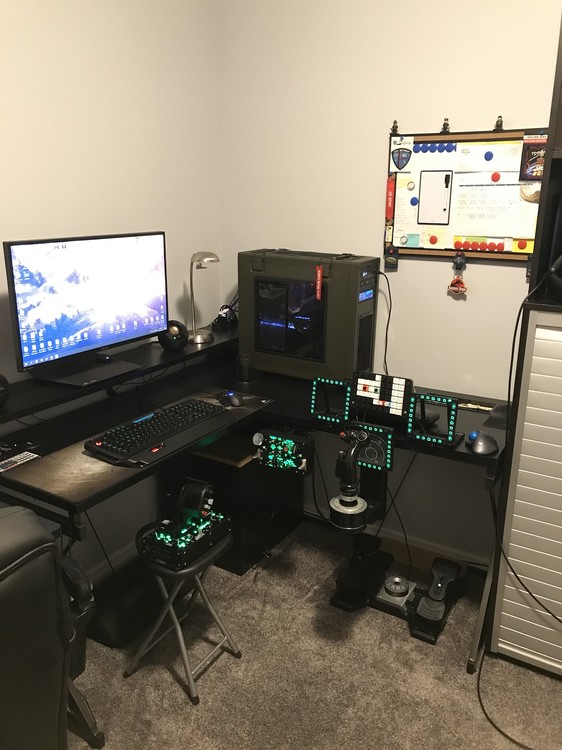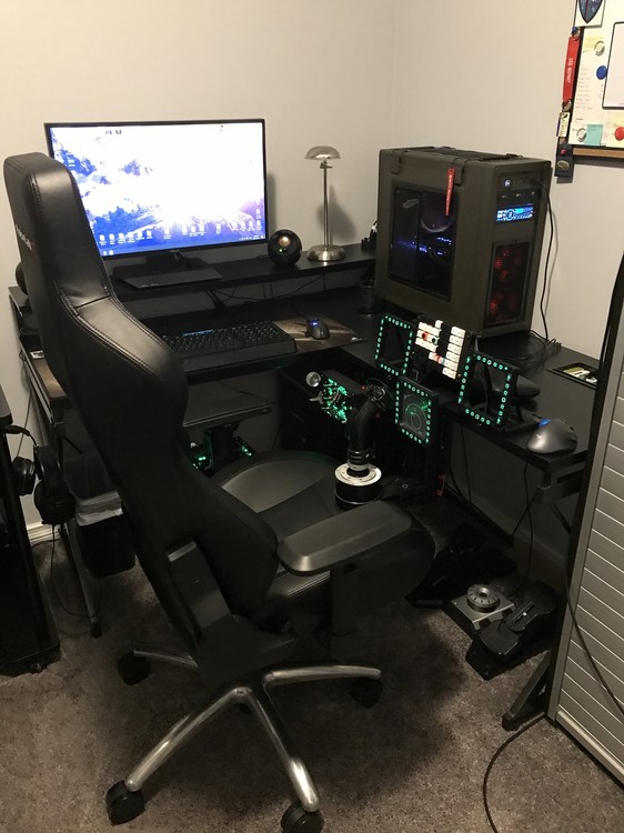 Hey everyone, Thought I'd share my flight setup for DCS. I started building on this project last year when I bought a new house with my wife. As I also play a variety of other games, and usually switch between different aircraft in DCS, I needed something that was both functional and non-intrusive. My wife's desk is to the left of mine where she plays games as well, including DCS when we occasionally fly together. I'd have made a permanent set-up in her space, but I think being able to game together is a reasonable trade-off! The current setup includes a Koolertron Keyboard that I use as a UFC, and the Monstertech mount for the stick make it easy to move it over to the side for the Viper. When building this setup, it was made to be VR friendly. Unstowed Without Chair: Unstowed With Chair: Closeup of peripherals: The WinWing Take-Off panel can be swiveled inwards to avoid being in the way of the chair when I'm not flying. Stowed: Coming up, I'm looking to get a TekCreations armament switch that I can place beside the left MDF, and I may try to find a better solution for the throttle (maybe something that enables me to slide it out). Hopefully this gives some people additional ideas for a stowable setup. Thanks everyone!