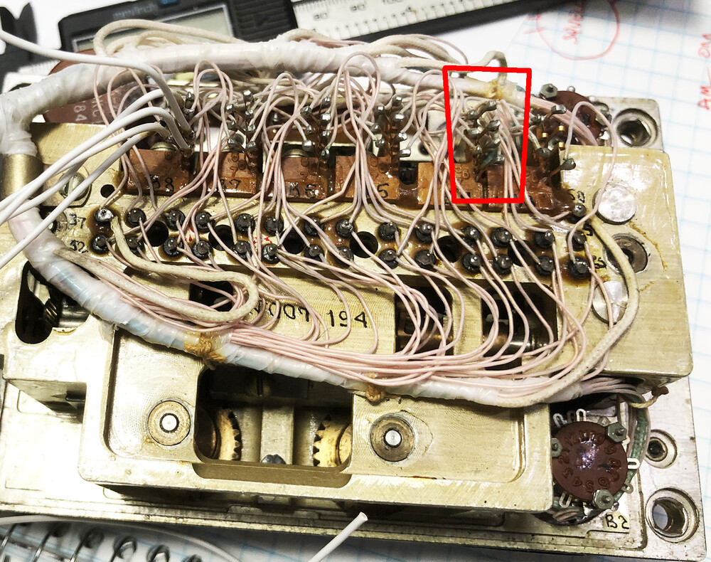 Hi No1sonuk, Thanks again for your kind help with this. Part number for the switch.... This is a piece of Soviet era tech, using a mixture of clockwork dials and cogs, in combination with some analogue switch mechanisms. There are 6 contacts and a common. These contacts are individual switches on/off, up/down, live/dead, (pick your definition!), depending on the brass contacts on the wheel turned by turning the dial. Think wind up clockwork music box...Those 7 brass springs (inside the red box) are used to output a 6 digit binary code. Hence my numbers like 00010110. These outputs have been read by multimeter for continuity by pin. Each switch set per dial uses the same codes thankfully, outputting a number 0-9. In the case of the 1MHz dial, there is an extra switch set (far right in pic) which has only 2 pins, and is mechanically driven by the clockwork to give a 0 or 10, to roll from 2 MHz up to 17MHz. So, in terms of port reading, I sort of expect it to work, as a very similar system is used in the (also authentic soviet) ARC-15 and R-863 channel selector. All mechanical clockwork with brass pins and analogue switches. I coulda stripped out all the stuff in the back and rigged up some rotary encoders, but I love all the original artistry and engineering in the back, plus it retains the feel and sound of the clicks etc. I ran a test sketch using the Arduino pins as simple inputs, not as port register, and I get correct outputs, eg (pseudo) {Increase 1MHz by 1, (pin) A0}. And as I say, in SOCAT the correct numbers are showing in the stream of data, but not going to DCS....
