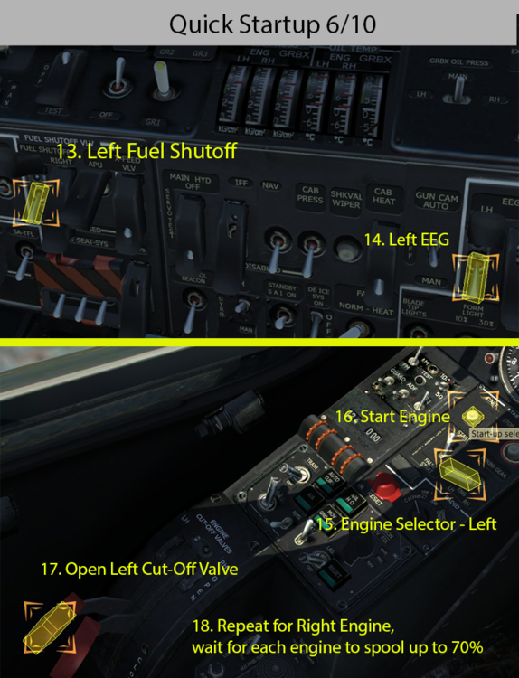So, inspired by the other existing quick startup kneeboard mods for the MiG-21 and MiG-15, I decided to make a version of it for the Ka-50. This mod adds pages to the kneeboard of the Ka-50 that go through the basic startup procedure. Will get you from cold and dark to hot and running. http://www.digitalcombatsimulator.com/en/files/1784979/index.php known bugs: pages skip from 2 straight to 4, page 3 was a duplicate by accident and I haven't gotten around to renaming the title at the top of each page. KA-50 Quick Startup Kneeboard.zip