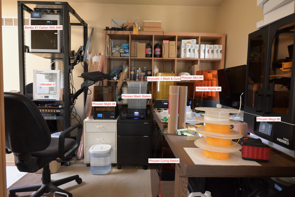 6. Bought a Bambu X1 Carbon, upper left in the picture of my 3D printing "nook." Not shown in the picture is my messy vacuum pump, pot, and hoses on the floor! Boy, is this X1 Carbon fast! Don't get me wrong. I love my Ultimaker 3. It's my go-to printer, despite my plenty of other "choices." Slice it, send the file over, as long as the damned auto-leveling passes, it will print and get me what I want.... just slow... but very reliable. What I have problem with.... is Ultimaker's direction -- enterprise-oriented direction. New Hardware has very little innovation, and charge an arm and a leg.... and worst of all, no upgrade path for faithful customers like me. No Ruby print head and abrasive filament resistant parts that are in the S3 and S5 but no upgrade path for me, and charge like USD $4,500+ for a new S3! So, I can't print carbon fiber with my Ultimaker 3..... ya ya ya... I can try to mod it and stuff... but thank you but no thanks for messing with my primary printer! So, I have ordered some PETG CF (Carbon Fiber) from Bambu... maybe that will be good enough (I doubt it!, but I got to give it a try, right? And, I am sticking to it as my "justification" for buying the X1 Carbon!).