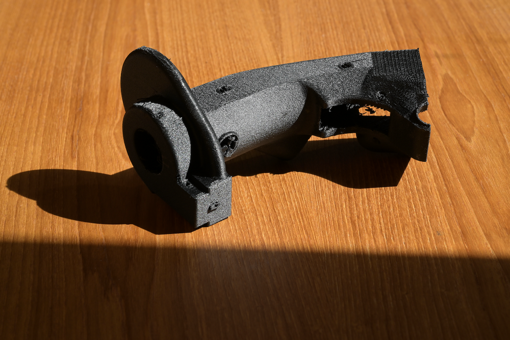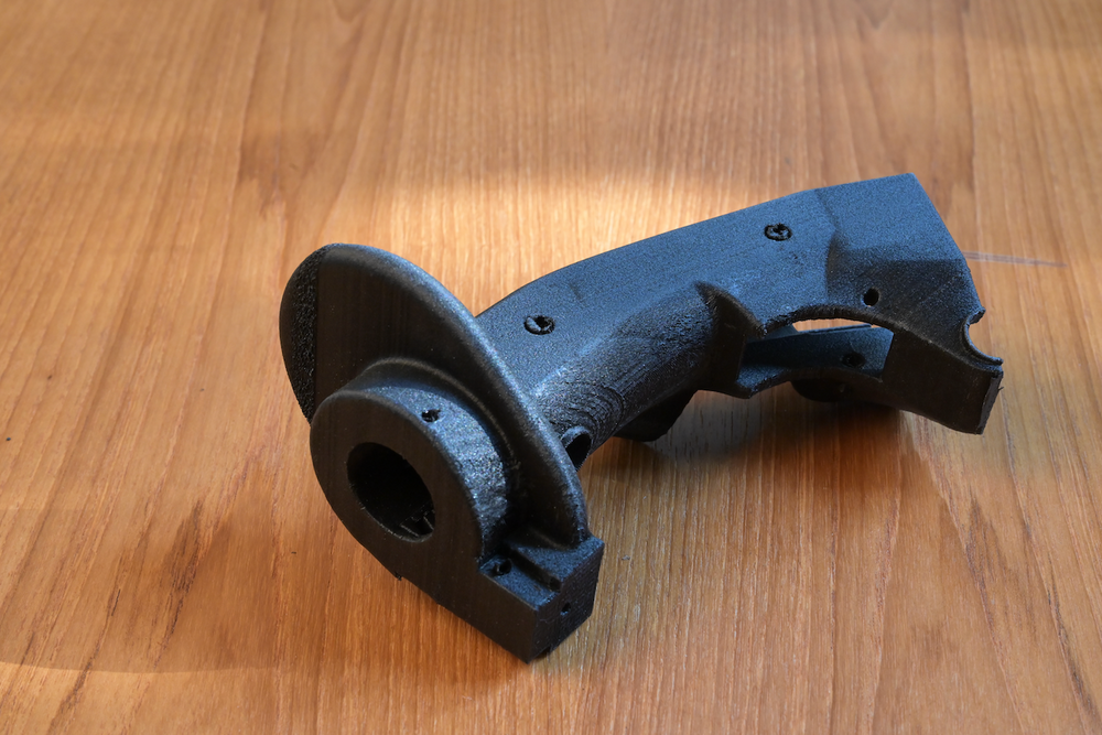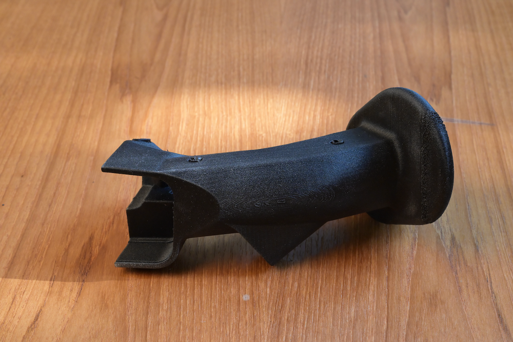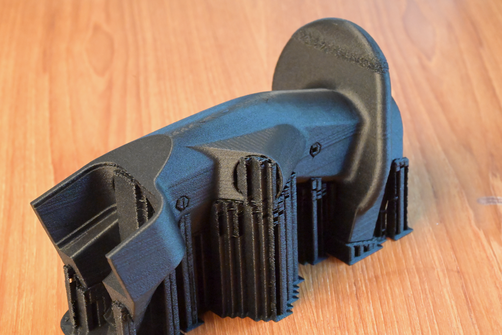 3. Nylon 12 Carbon Fiber printed (damn, I forgot to get rid of the screw holes designed for fastening two halves!). The surface condition on the supported side doesn't look too bad, nothing a bit sanding couldn't solve. There are some surface defects on the top side as well... nothing a little epoxy potty and sanding couldn't solve. It's incredibly light (feels cheap), but strong. Next time, I will try printing it with 100% infill (and get rid of the unneeded screw holes). Now I just have to figure out how to get the support materials out of the core. Don't need to have perfect surface condition inside... so shouldn't be a problem. Next time, I might print it with the trigger side down. This way, the surfaces we see mostly have better surface condition.