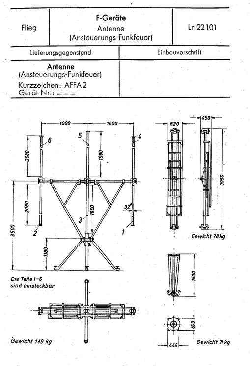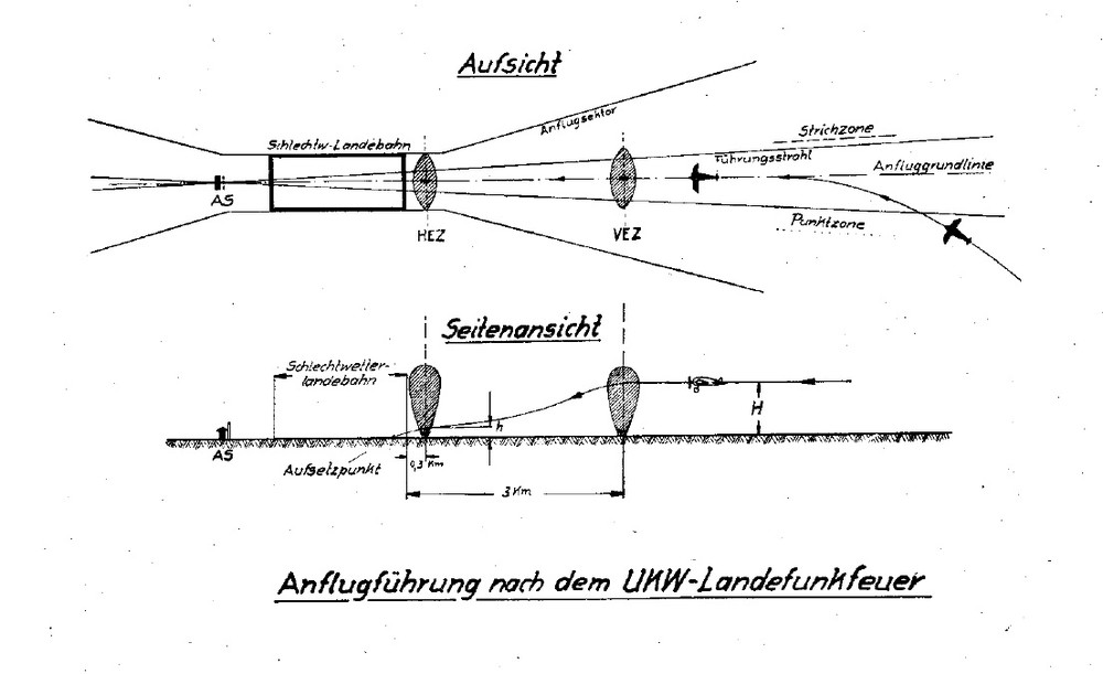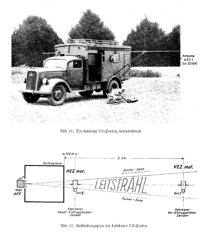 17. I came upon a website that has uploaded original Luftwaffe documents (in German) and here's what I 've come up with : - The Lorenz blind landing system (UKW-LFF) is consisted of a Transmitting-Directional Unit (the AnflugFuhrungSender or AS) and 2 markers placed at 300m and 3000m from the runway end (the EinflugZeichenSenders or EZS, inner is HEZ and outer is VEZ). The Directional unit is made up of a Transmitter (inside a military truck) and an antenna : There are Various Powers for the Transmitters, as described in the Luftwaffe Manual No 4458, Dated June 1943, AS2, AS3 (120W) and AS4 (500W). The Antenna used is referred to in the manual as AFFA-2. I found the Schematics and a picture of this antenna in LuftWaffe manual no 4454 : The location of the Antenna relative to the truck carrying the Electronic aparratus can be found here in the next pages : Another elaborate schematic can be found in Luftwaffe manual 4455 : The AS4 (500W) transmitter's pattern is shown in Luftwaffe manual No 4456 (also has schematics) : I believe that this was the true shape of the Lorenz system, having an Antenna with 3 vertical rods and a truck 17 meters behind it bearing the electronic apparatus. The other pictures shown earlier in this thread, that are more complex, are probably radars or navigation aids for the nightfighters and not part of the Lorenz system. Since you are modelling the entire system, you may also find useful some photos and schematics of the EZ marker antennas with their trucks (Luftwaffe manual No 4451): And their force-field distribution : Links to Luftwaffe and Lorenz company manual (much more info on the operation and schematics of these systems inside): -All the manuals compiled : http://www.cdvandt.org/manuals.htm -4451 (Lorenz+markers) :http://www.cdvandt.org/D-Luft-T-4451-5-Watt-UKW-Einflugzeichensend.pdf -4458 (description of all components of the Lorenz system briefly) : http://www.cdvandt.org/D-Luft-T-4458-UKW-Landefunkfeuer-120Wund500W.pdf -4454 (AFFA-2 antenna + picture+schematics) : http://www.cdvandt.org/D-Luft-T-4454-Antenne-AFFA-2.pdf -4452 (AS2 transmitter + schematics) : http://www.cdvandt.org/D-Luft-T-4452-Ansteuer-Sender-AS-2.pdf -4455 : http://www.cdvandt.org/D-Luft-T-4455-BuG.pdf -4456 (AS4 schematics+ field characteristics) : http://www.cdvandt.org/D-Luft-T-4456-Anflugfuehrungssender%204.pdf -Original Document about this system by Lorenz Company (pretty much the same as the luftwaffe manuals, no photos of the antennas) : http://www.nonstopsystems.com/radio/pdf-hell/article-hell-Fu-Bl-1-Ex.pdf In the cdvandt.com page there also the original manuals for most of the FuG systems, with the AFN-1 and AFN-2 instruments as well : FuG16ZY : http://www.cdvandt.org/D-Luft-T-4069-FuG-16ZY.pdf i hope this helps