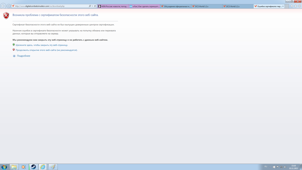 Всем привет. Хотел скачать DCS World(http://www.digitalcombatsimulator.com/ru/download.php). Получил вот это: Ошибка сертификата: переход заблокирован. Сертификат безопасности этого веб-сайта не был выпущен доверенным центром сертификации. Наличие ошибок в сертификате безопасности может указывать на попытку обмана или перехвата данных, которые вы отправляете на сервер. Прошу обратить внимание ED на ошибку сертификата безопасности.