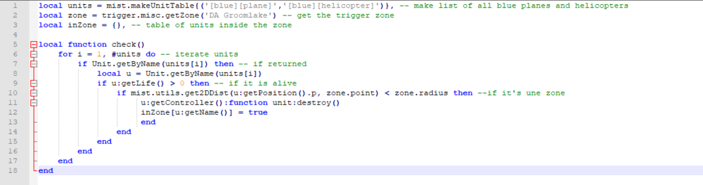 What I want is destroying player aircraft/helicopter unit in a specific zone (here DA Groomlake) I had a look on the web, and I try to copy/paste some lines from some scripts I found, and I came to this: local units = mist.makeUnitTable{('[blue][plane]','[blue][helicopter]')}, -- make list of all blue planes and helicopters local zone = trigger.misc.getZone('DA Groomlake') -- get the trigger zone local inZone = {}, -- table of units inside the zone local function check() for i = 1, #units do -- iterate units if Unit.getByName(units) then -- if returned local u = Unit.getByName(units) if u:getLife() > 0 then -- if it is alive if mist.utils.get2DDist(u:getPosition().p, zone.point) < zone.radius then --if it's une zone u:getController():function unit:destroy() inZone[u:getName()] = true end end end end end end Of course, I tried it and had mist error message in game. But am I close from something ? I copiedpasted some stuff, but I do not know anything about lua