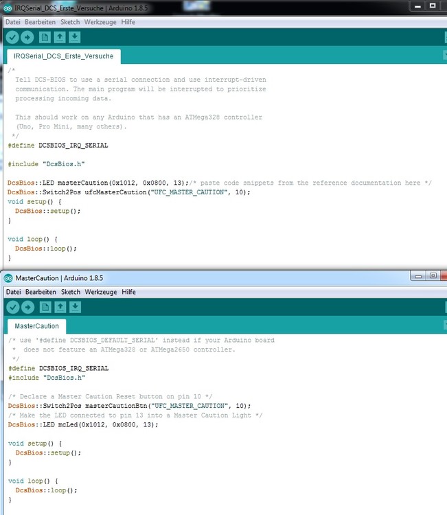 Mir ist noch etwas in den Sketch Kommentaren aufgefallen ich weiss nicht ob das wichtig ist. Ich habe meinen Sketch (Master Caution Button an PIN10 & Master Caution Warnlicht LED an Pin 13) in zwei Ausführungen ausprobiert. Meinen ersten Sketch habe ich nach Anleitung des user Guides gemacht. Dabei habe ich unter den Beispielen aus der BIOS library die "IRQserial" geladen und die Befehle mit Verbindung zu den Pins zugesetzt- editiert ganz nach Anleitung. Unter den Kommentaren der IRQserial Vorlage heißt es in grau :"This should work on any Arduino that has an ATMega328 controller(Uno, Pro Mini, many others).." also da steht nicht explicit das das ATMEGA2560 unterstützt wird. Ich verwende aber das ATMega2560 also Arduino Mega 2560.Ich weiß nicht inwiefern das problematisch ist. Das das nicht lief habe ich den in der DCS Bios library festeglegten "MASTER CAUTION" Sketch geladen(die Pins sind hier bereits definiert und genau identisch zu meiner ersten Schaltung). Hier steht in den Kommentaren "does not feature an ATMega328 or ATMega2650 controller" Beide Sketche lege ich bei. In beiden Fällen beginnen die Sketche mit den Zeilen: #define DCSBIOS_IRQ_SERIAL #include "DcsBios.h" Stimmt damit etwas nicht?