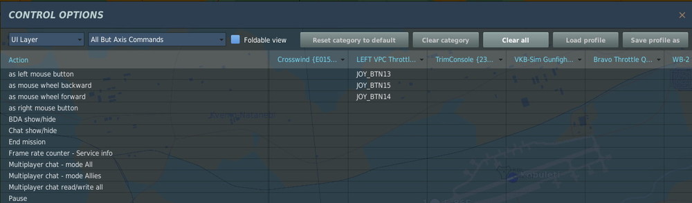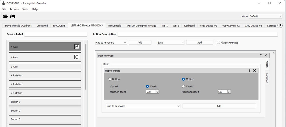 Hi, I am new to VIRPIL. I would like to use ministick on T-50cm3 as a mouse for moving F10 map (while holding down left mouse button). So I used Joystick Gremlin to map X and Y ministick axis to mouse (see attachment). I can use ministick for cursor movement on Desktop now. But it does not work on DCS F10 map. P.S. In DCS I mapped one T-50cm3 button as a Left Mouse button and this button works well as intended (see second attachment). What do I miss? THX